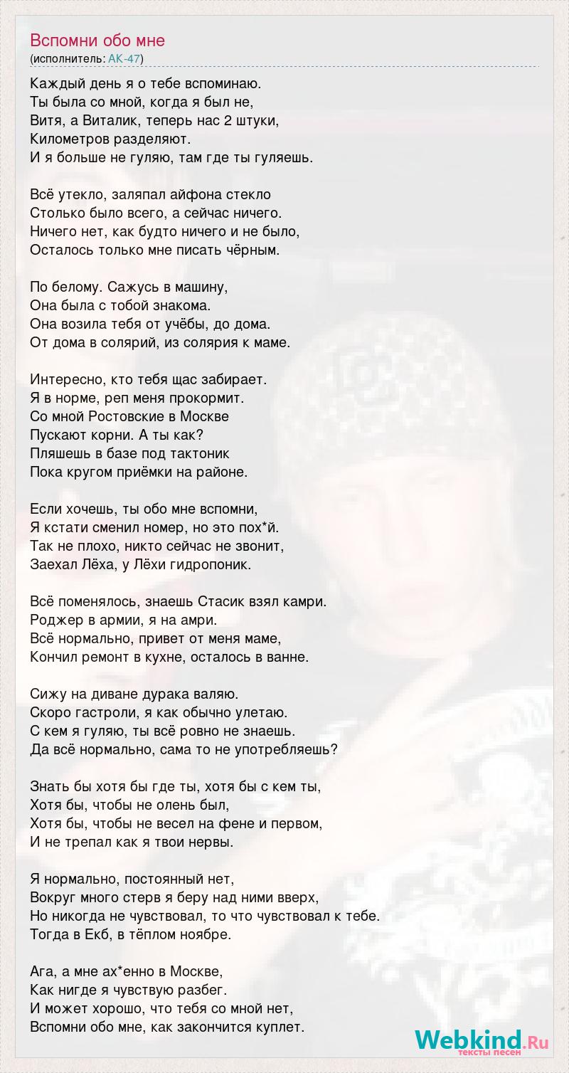 Каждый день я о тебе вспоминаю. Ты была со мной, когда я был не, Витя, а Виталик, теперь нас 2 штуки, Километров разделяют. И я больше не гуляю, там где ты гуляешь. Всё утекло, заляпал айфона стекло Столько было всего, а сейчас ничего. Ничего нет, как будто ничего и не было, Осталось только мне писать чёрным. По белому. Сажусь в машину, Она была с тобой знакома. Она возила тебя от учёбы, до дома. От дома в солярий, из солярия к маме. Интересно, кто тебя щас забирает. Я в норме, реп меня прокормит. Со мной Ростовские в Москве Пускают корни. А ты как? Пляшешь в базе под тактоник Пока кругом приёмки на районе. Если хочешь, ты обо мне вспомни, Я кстати сменил номер, но это пох*й. Так не плохо, никто сейчас не звонит, Заехал Лёха, у Лёхи гидропоник. Всё поменялось, знаешь Стасик взял камри. Роджер в армии, я на амри. Всё нормально, привет от меня маме, Кончил ремонт в кухне, осталось в ванне. Сижу на диване дурака валяю. Скоро гастроли, я как обычно улетаю. С кем я гуляю, ты всё ровно не знаешь. Да всё нормально, сама то не употребляешь? Знать бы хотя бы где ты, хотя бы с кем ты, Хотя бы, чтобы не олень был, Хотя бы, чтобы не весел на фене и первом, И не трепал как я твои нервы. Я нормально, постоянный нет, Вокруг много стерв я беру над ними вверх, Но никогда не чувствовал, то что чувствовал к тебе. Тогда в Екб, в тёплом ноябре. Ага, а мне ах*енно в Москве, Как нигде я чувствую разбег. И может хорошо, что тебя со мной нет, Вспомни обо мне, как закончится куплет.