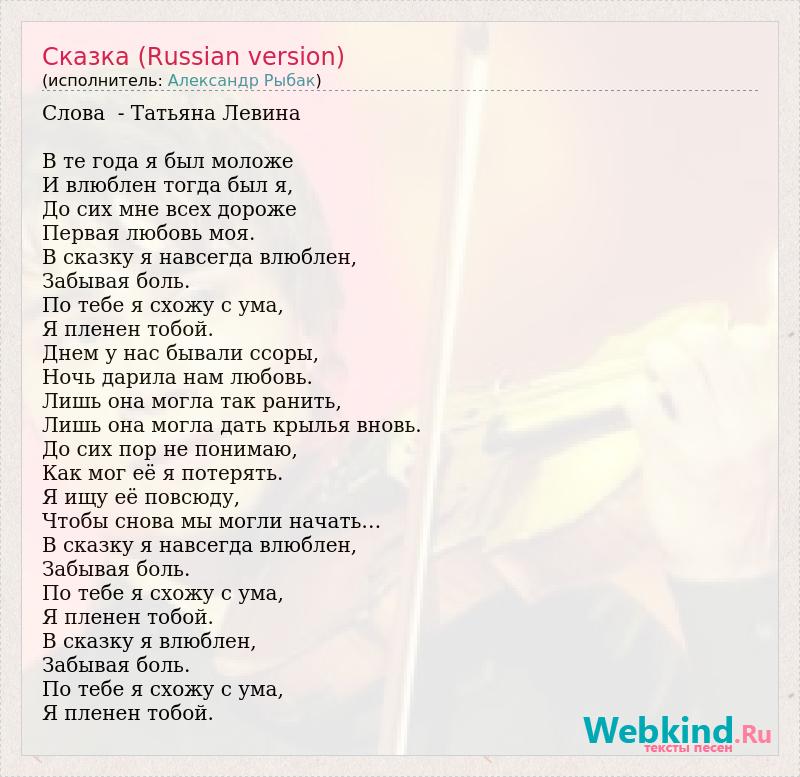 Слова - Татьяна Левина В те года я был моложе И влюблен тогда был я, До сих мне всех дороже Первая любовь моя. В сказку я навсегда влюблен, Забывая боль. По тебе я схожу с ума, Я пленен тобой. Днем у нас бывали ссоры, Ночь дарила нам любовь. Лишь она могла так ранить, Лишь она могла дать крылья вновь. До сих пор не понимаю, Как мог её я потерять. Я ищу её повсюду, Чтобы снова мы могли начать… В сказку я навсегда влюблен, Забывая боль. По тебе я схожу с ума, Я пленен тобой. В сказку я влюблен, Забывая боль. По тебе я схожу с ума, Я пленен тобой.