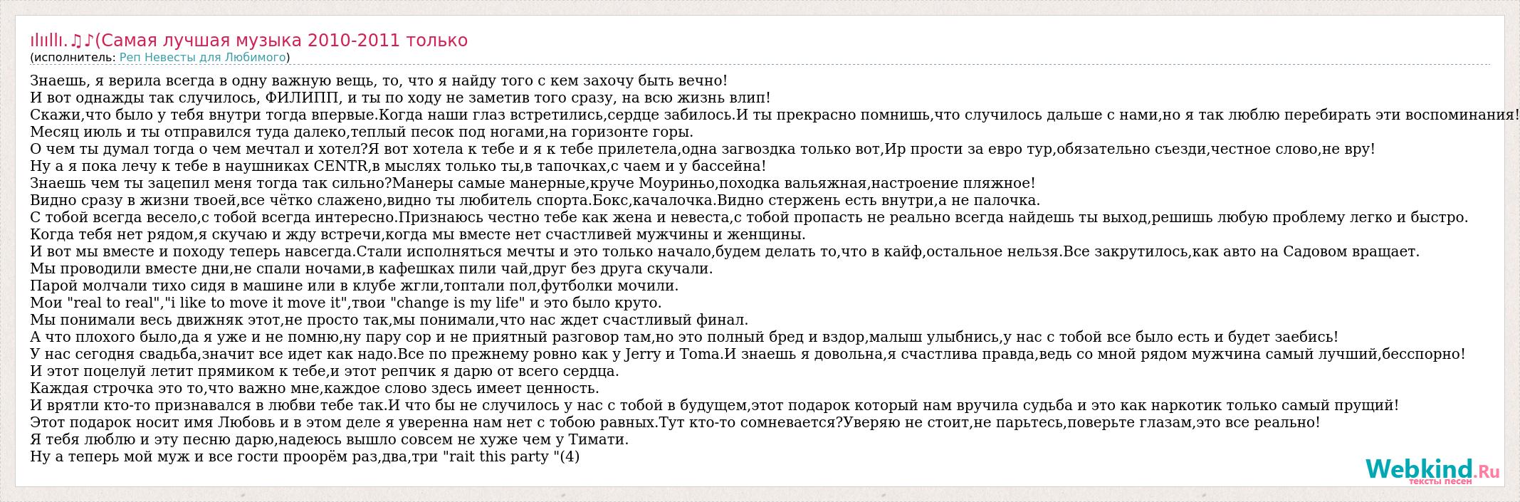 Знаешь, я верила всегда в одну важную вещь, то, что я найду того с кем захочу быть вечно! И вот однажды так случилось, ФИЛИПП, и ты по ходу не заметив того сразу, на всю жизнь влип! Скажи,что было у тебя внутри тогда впервые.Когда наши глаз встретились,сердце забилось.И ты прекрасно помнишь,что случилось дальше с нами,но я так люблю перебирать эти воспоминания! Месяц июль и ты отправился туда далеко,теплый песок под ногами,на горизонте горы. О чем ты думал тогда о чем мечтал и хотел?Я вот хотела к тебе и я к тебе прилетела,одна загвоздка только вот,Ир прости за евро тур,обязательно съезди,честное слово,не вру! Ну а я пока лечу к тебе в наушниках CENTR,в мыслях только ты,в тапочках,с чаем и у бассейна! Знаешь чем ты зацепил меня тогда так сильно?Манеры самые манерные,круче Моуриньо,походка вальяжная,настроение пляжное! Видно сразу в жизни твоей,все чётко слажено,видно ты любитель спорта.Бокс,качалочка.Видно стержень есть внутри,а не палочка. С тобой всегда весело,с тобой всегда интересно.Признаюсь честно тебе как жена и невеста,с тобой пропасть не реально всегда найдешь ты выход,решишь любую проблему легко и быстро. Когда тебя нет рядом,я скучаю и жду встречи,когда мы вместе нет счастливей мужчины и женщины. И вот мы вместе и походу теперь навсегда.Стали исполняться мечты и это только начало,будем делать то,что в кайф,остальное нельзя.Все закрутилось,как авто на Садовом вращает. Мы проводили вместе дни,не спали ночами,в кафешках пили чай,друг без друга скучали. Парой молчали тихо сидя в машине или в клубе жгли,топтали пол,футболки мочили. Мои "real to real","i like to move it move it",твои "change is my life" и это было круто. Мы понимали весь движняк этот,не просто так,мы понимали,что нас ждет счастливый финал. А что плохого было,да я уже и не помню,ну пару сор и не приятный разговор там,но это полный бред и вздор,малыш улыбнись,у нас с тобой все было есть и будет заебись! У нас сегодня свадьба,значит все идет как надо.Все по прежнему ровно как у Jerry и Toma.И знаешь я довольна,я счастлива правда,ведь со мной рядом мужчина самый лучший,бесспорно! И этот поцелуй летит прямиком к тебе,и этот репчик я дарю от всего сердца. Каждая строчка это то,что важно мне,каждое слово здесь имеет ценность. И врятли кто-то признавался в любви тебе так.И что бы не случилось у нас с тобой в будущем,этот подарок который нам вручила судьба и это как наркотик только самый прущий! Этот подарок носит имя Любовь и в этом деле я уверенна нам нет с тобою равных.Тут кто-то сомневается?Уверяю не стоит,не парьтесь,поверьте глазам,это все реально! Я тебя люблю и эту песню дарю,надеюсь вышло совсем не хуже чем у Тимати. Ну а теперь мой муж и все гости проорём раз,два,три "rait this party "(4)