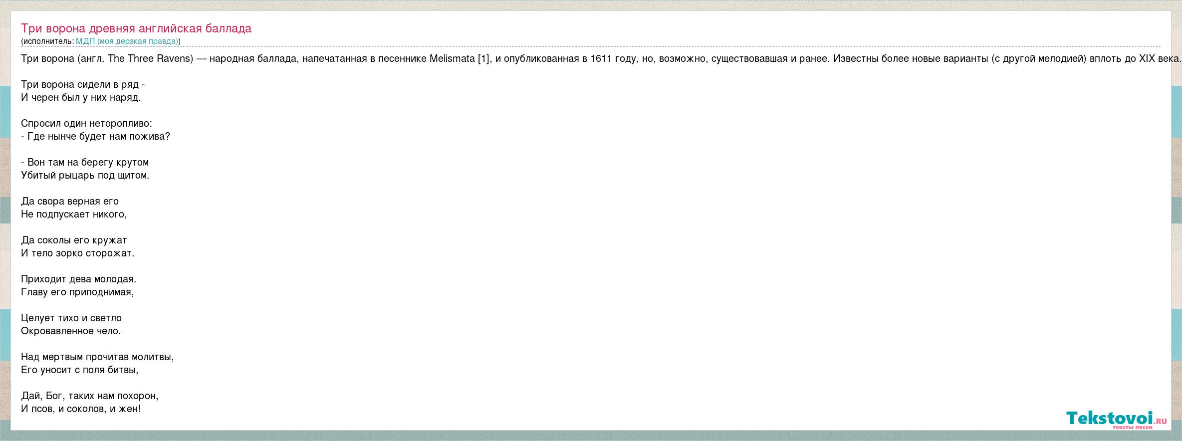 Три ворона (англ. The Three Ravens) — народная баллада, напечатанная в песеннике Melismata [1], и опубликованная в 1611 году, но, возможно, существовавшая и ранее. Известны более новые варианты (с другой мелодией) вплоть до XIX века. Tри ворона сидели в ряд - И черен был у них наряд. Спросил один неторопливо: - Где нынче будет нам пожива? - Вон там на берегу крутом Убитый рыцарь под щитом. Да свора верная его Не подпускает никого, Да соколы его кружат И тело зорко сторожат. Приходит дева молодая. Главу его приподнимая, Целует тихо и светло Окровавленное чело. Над мертвым прочитав молитвы, Его уносит с поля битвы, Дай, Бог, таких нам похорон, И псов, и соколов, и жен!