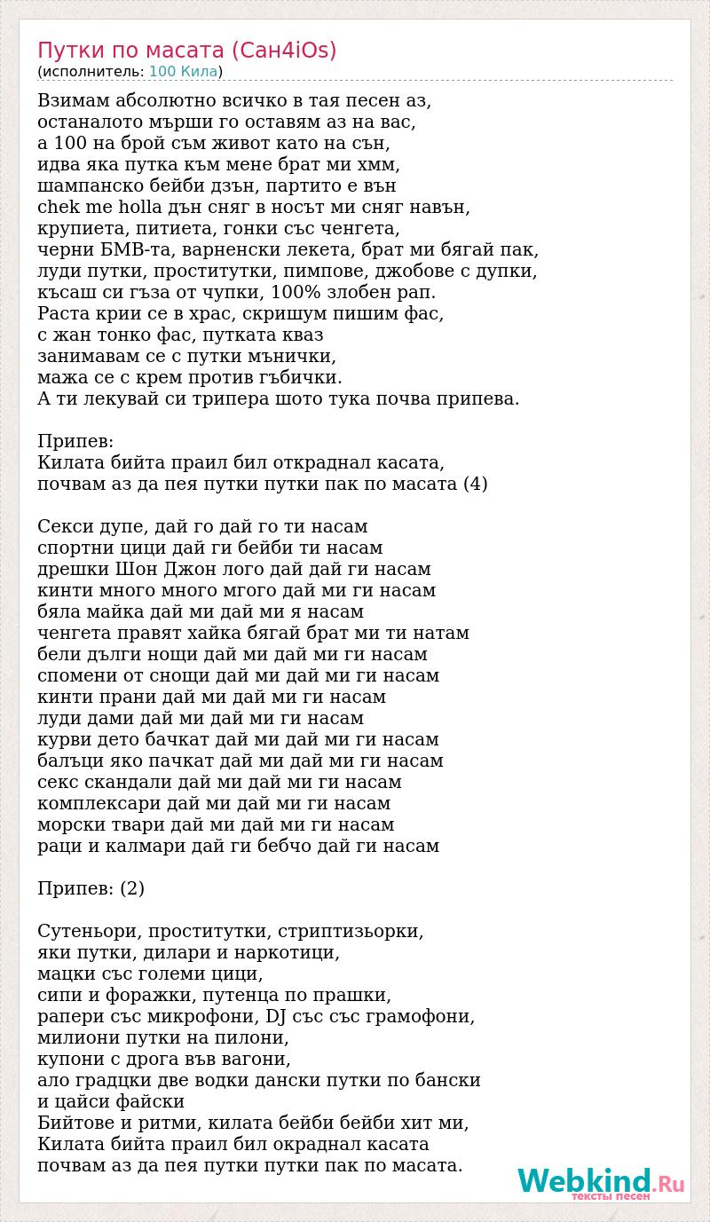Взимам абсолютно всичко в тая песен аз, останалото мърши го оставям аз на вас, а 100 на брой съм живот като на сън, идва яка путка към мене брат ми хмм, шампанско бейби дзън, партито е вън chek me holla дън сняг в носът ми сняг навън, крупиета, питиета, гонки със ченгета, черни БМВ-та, варненски лекета, брат ми бягай пак, луди путки, проститутки, пимпове, джобове с дупки, късаш си гъза от чупки, 100% злобен рап. Раста крии се в храс, скришум пишим фас, с жан тонко фас, путката кваз занимавам се с путки мънички, мажа се с крем против гъбички. А ти лекувай си трипера шото тука почва припева. Припев: Килата бийта праил бил откраднал касата, почвам аз да пея путки путки пак по масата (4) Секси дупе, дай го дай го ти насам спортни цици дай ги бейби ти насам дрешки Шон Джон лого дай дай ги насам кинти много много мгого дай ми ги насам бяла майка дай ми дай ми я насам ченгета правят хайка бягай брат ми ти натам бели дълги нощи дай ми дай ми ги насам спомени от снощи дай ми дай ми ги насам кинти прани дай ми дай ми ги насам луди дами дай ми дай ми ги насам курви дето бачкат дай ми дай ми ги насам балъци яко пачкат дай ми дай ми ги насам секс скандали дай ми дай ми ги насам комплексари дай ми дай ми ги насам морски твари дай ми дай ми ги насам раци и калмари дай ги бебчо дай ги насам Припев: (2) Сутеньори, проститутки, стриптизьорки, яки путки, дилари и наркотици, мацки със големи цици, сипи и форажки, путенца по прашки, рапери със микрофони, DJ със със грамофони, милиони путки на пилони, купони с дрога във вагони, ало градцки две водки дански путки по бански и цайси файски Бийтове и ритми, килата бейби бейби хит ми, Килата бийта праил бил окраднал касата почвам аз да пея путки путки пак по масата.