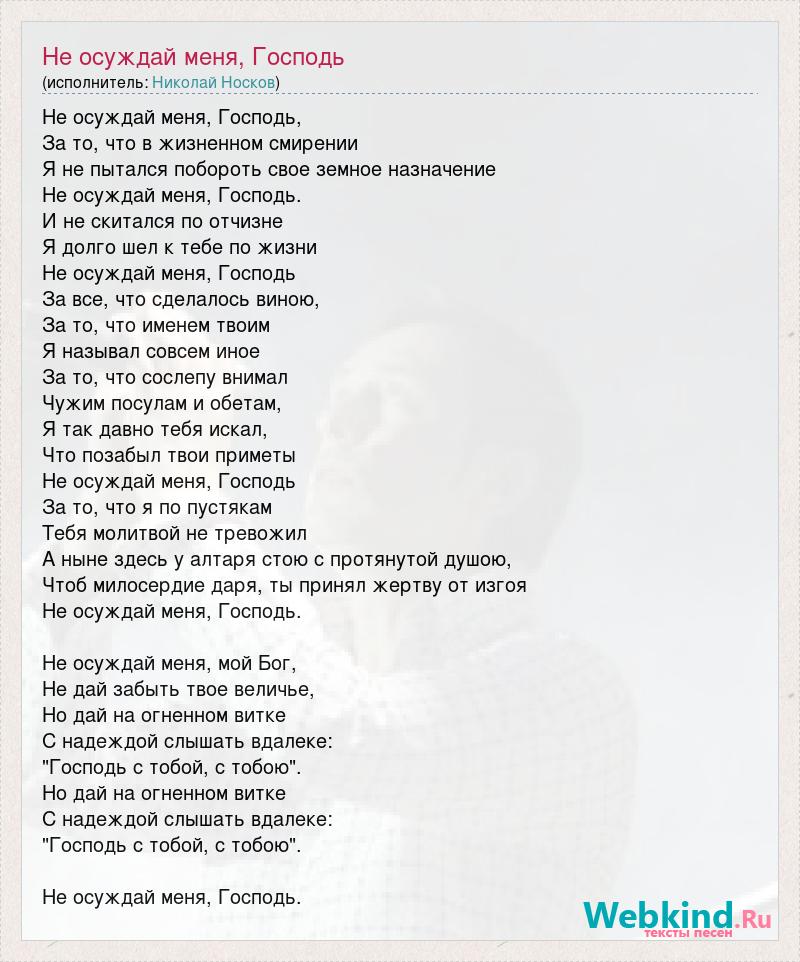 Не осуждай меня, Господь, За то, что в жизненном смирении Я не пытался побороть свое земное назначение Не осуждай меня, Господь. И не скитался по отчизне Я долго шел к тебе по жизни Не осуждай меня, Господь За все, что сделалось виною, За то, что именем твоим Я называл совсем иное За то, что сослепу внимал Чужим посулам и обетам, Я так давно тебя искал, Что позабыл твои приметы Не осуждай меня, Господь За то, что я по пустякам Тебя молитвой не тревожил А ныне здесь у алтаря стою с протянутой душою, Чтоб милосердие даря, ты принял жертву от изгоя Не осуждай меня, Господь. Не осуждай меня, мой Бог, Не дай забыть твое величье, Но дай на огненном витке С надеждой слышать вдалеке: "Господь с тобой, с тобою". Но дай на огненном витке С надеждой слышать вдалеке: "Господь с тобой, с тобою". Не осуждай меня, Господь.