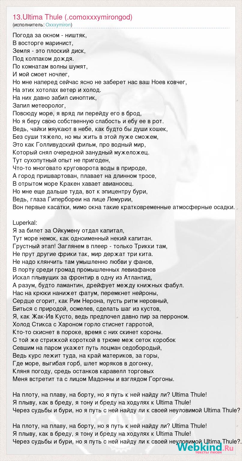Погода за окном - ништяк, В восторге маринист, Земля - это плоский диск, Под колпаком дождя. По комнатам волны шумят, И мой смоет ночлег, Но мне наперед сейчас ясно не заберет нас ваш Ноев ковчег, На этих хотолах ветер и холод. На них давно забил синоптик, Запил метеоролог, Повсюду море, я вряд ли перейду его в брод, Но я беру свою собственную слабость и ебу ее в рот. Ведь, чайки мяукают в небе, как будто бы души кошек, Без суши тяжело, но мы жить в этой луже сможем, Это как Голливудский фильм, про водный мир, Который снял очередной занудный мужеложец. Тут сухопутный опыт не пригоден, Что-то многовато круговорота воды в природе, А город пришвартован, плавает на длинном тросе, В отрытом море Кракен хавает авианосец. Но мне еще дальше туда, вот к эпицентру бури, Ведь, глаза Гипербореи на лице Лемурии, Вон первые касатки, мимо окна такие кратковременные атмосферные осадки. Luperkal: Я за билет за Ойкумену отдал капитал, Тут море немок, как одноименный некий капитан. Грустный этап! Заглянем в плеер - только Трикки там, Не прут другие фрики так, мир держат три кита. Не надо клянчить там умышленно любви у фанов, В порту среди громад промышленных левиафанов Искал плывущих за фронтир в одну из Атлантид, А разум, будто ламантин, дрейфует между книжных фабул. Нас на крюки нанижет фатум, перемкнет нейроны, Сердце сгорит, как Рим Нерона, пусть ритм неровный, Биться с природой, осмелев, сделать шаг из кустов, Я, как Жак-Ив Кусто, ведь предпочел давно пир за перроном. Холод Стикса с Хароном горло стиснет гарротой, Кто-то скиснет в пороке, время с них скинет короны. С той же стрижкой короткой в трюме меж сеток коробок Севшим на паром укажет путь лоцман седобородый, Ведь курс лежит туда, на край материков, за горы, Где море, выгибая горб, шлет моряков в догонку, Кляня погоду, средь останков каравелл торговых Меня встретит та с лицом Мадонны и взглядом Горгоны. На плоту, на плаву, на борту, но я путь к ней найду ли? Ultima Thule! Я плыву, как в бреду, я тону и бреду на ходулях к Ultima Thule! Через судьбы и бури, но я путь с ней найду ли к своей неуловимой Ultima Thule? На плоту, на плаву, на борту, но я путь к ней найду ли? Ultima Thule! Я плыву, как в бреду, я тону и бреду на ходулях к Ultima Thule! Через судьбы и бури, но я путь с ней найду ли к своей неуловимой Ultima Thule?.
