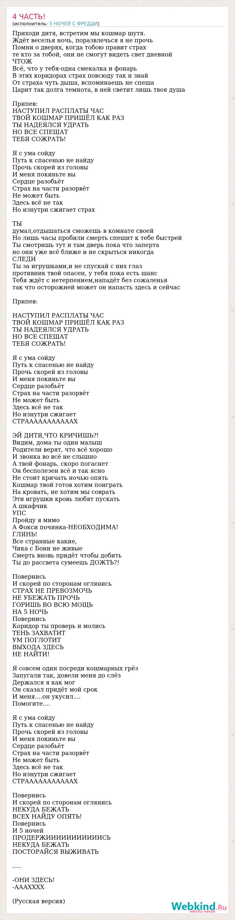 Приходи дитя, встретим мы кошмар шутя. Ждёт веселья ночь, поразвлечься я не прочь Помни о дверях, когда тобою правит страх те кто за тобой, они не смогут видеть свет дневной ЧТОЖ Всё, что у тебя-одна смекалка и фонарь В этих коридорах страх повсюду так и знай От страха чуть дыша, вспоминаешь не спеша Царит так долга темнота, в ней светит лишь твоя душа Припев: НАСТУПИЛ РАСПЛАТЫ ЧАС ТВОЙ КОШМАР ПРИШЁЛ КАК РАЗ ТЫ НАДЕЯЛСЯ УДРАТЬ НО ВСЕ СПЕШАТ ТЕБЯ СОЖРАТЬ! Я с ума сойду Путь к спасенью не найду Прочь скорей из головы И меня покиньте вы Сердце разобьёт Страх на части разорвёт Не может быть Здесь всё не так Но изнутри сжигает страх ТЫ думал,отдышаться сможешь в комнате своей Но лишь часы пробили смерть спешит к тебе быстрей Ты смотришь тут и там дверь пока что заперта но они уже всё ближе и не скрыться никогда СЛЕДИ Ты за игрушками,и не спускай с них глаз противник твой опасен, у тебя пока есть шанс Тебя ждёт с нетерпением,нападёт без сожаленья так что осторожней может он напасть здесь и сейчас Припев: НАСТУПИЛ РАСПЛАТЫ ЧАС ТВОЙ КОШМАР ПРИШЁЛ КАК РАЗ ТЫ НАДЕЯЛСЯ УДРАТЬ НО ВСЕ СПЕШАТ ТЕБЯ СОЖРАТЬ! Я с ума сойду Путь к спасенью не найду Прочь скорей из головы И меня покиньте вы Сердце разобьёт Страх на части разорвёт Не может быть Здесь всё не так Но изнутри сжигает СТРАААААААААААХ ЭЙ ДИТЯ,ЧТО КРИЧИШЬ?! Видим, дома ты один малыш Родители верят, что всё хорошо И звонка во всё не слышно А твой фонарь, скоро погаснет Он бесполезен всё и так ясно Не стоит кричать ночью опять Кошмар твой готов хотим поиграть На кровать, не хотим мы соврать Эти игрушки кровь любят пускать А шкафчик УПС Пройду я мимо А Фокси починка-НЕОБХОДИМА! ГЛЯНЬ! Все странные какие, Чика с Бони не живые Смерть вновь придёт чтобы добить Ты до рассвета сумеешь ДОЖТЬ?! Повернись И скорей по сторонам оглянись СТРАХ НЕ ПРЕВОЗМОЧЬ НЕ УБЕЖАТЬ ПРОЧЬ ГОРИШЬ ВО ВСЮ МОЩЬ НА 5 НОЧЬ Повернись Коридор ты проверь и молись ТЕНЬ ЗАХВАТИТ УМ ПОГЛОТИТ ВЫХОДА ЗДЕСЬ НЕ НАЙТИ! Я совсем один посреди кошмарных грёз Запугали так, довели меня до слёз Держался я как мог Он сказал придёт мой срок И меня....он укусил.... Помогите.... Я с ума сойду Путь к спасенью не найду Прочь скорей из головы И меня покиньте вы Сердце разобьёт Страх на части разорвёт Не может быть Здесь всё не так Но изнутри сжигает СТРАААААААААААХ Повернись И скорей по сторонам оглянись НЕКУДА БЕЖАТЬ ВСЕХ НАЙДУ ОПЯТЬ! Повернись И 5 ночей ПРОДЕРЖИИИИИИИИИИИСЬ НЕКУДА БЕЖАТЬ ПОСТОРАЙСЯ ВЫЖИВАТЬ ..... -ОНИ ЗДЕСЬ! -АААХХХХ (Русская версия)