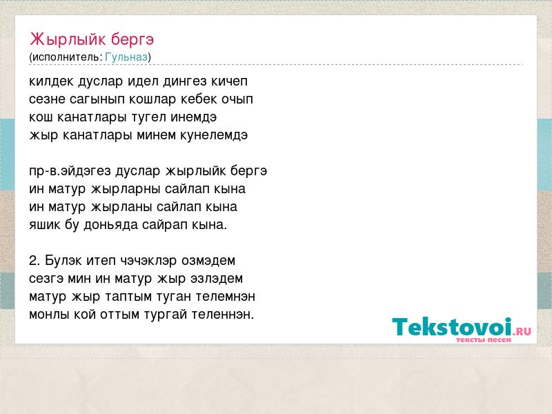 килдек дуслар идел дингез кичеп сезне сагынып кошлар кебек очып кош канатлары тугел инемдэ жыр канатлары минем кунелемдэ пр-в.эйдэгез дуслар жырлыйк бергэ ин матур жырларны сайлап кына ин матур жырланы сайлап кына яшик бу доньяда сайрап кына. 2. Булэк итеп чэчэклэр озмэдем сезгэ мин ин матур жыр эзлэдем матур жыр таптым туган телемнэн монлы кой оттым тургай теленнэн.