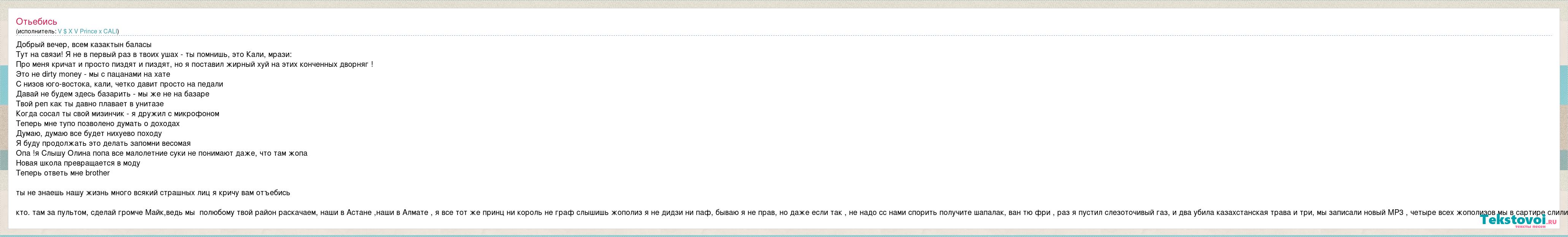 Добрый вечер, всем казактын баласы Тут на связи! Я не в первый раз в твоих ушах - ты помнишь, это Кали, мрази: Про меня кричат и просто пиздят и пиздят, но я поставил жирный хуй на этих конченных дворняг ! Это не dirty money - мы с пацанами на хате С низов юго-востока, кали, четко давит просто на педали Давай не будем здесь базарить - мы же не на базаре Твой реп как ты давно плавает в унитазе Когда сосал ты свой мизинчик - я дружил с микрофоном Теперь мне тупо позволено думать о доходах Думаю, думаю все будет нихуево походу Я буду продолжать это делать запомни весомая Опа !я Слышу Олина попа все малолетние суки не понимают даже, что там жопа Новая школа превращается в моду Теперь ответь мне brother ты не знаешь нашу жизнь много всякий страшных лиц я кричу вам отъебись кто. там за пультом, сделай громче Майк,ведь мы полюбому твой район раскачаем, наши в Астане ,наши в Алмате , я все тот же принц ни король не граф слышишь жополиз я не дидзи ни паф, бываю я не прав, но даже если так , не надо сс нами спорить получите шапалак, ван тю фри , раз я пустил слезоточивый газ, и два убила казахстанская трава и три, мы записали новый MP3 , четыре всех жополизов мы в сартире слили