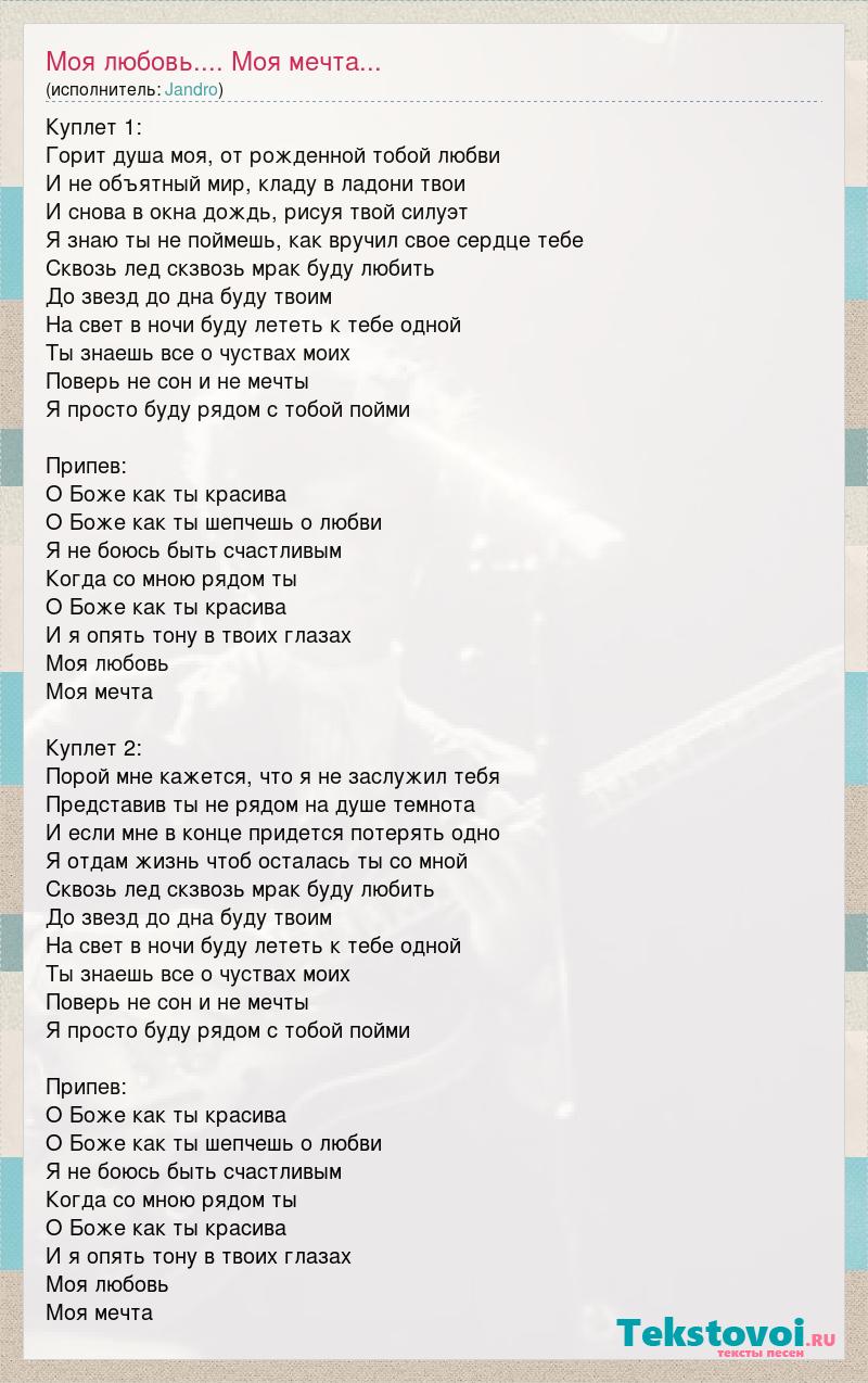 Куплет 1: Горит душа моя, от рожденной тобой любви И не объятный мир, кладу в ладони твои И снова в окна дождь, рисуя твой силуэт Я знаю ты не поймешь, как вручил свое сердце тебе Сквозь лед скзвозь мрак буду любить До звезд до дна буду твоим На свет в ночи буду лететь к тебе одной Ты знаешь все о чуствах моих Поверь не сон и не мечты Я просто буду рядом с тобой пойми Припев: О Боже как ты красива О Боже как ты шепчешь о любви Я не боюсь быть счастливым Когда со мною рядом ты О Боже как ты красива И я опять тону в твоих глазах Моя любовь Моя мечта Куплет 2: Порой мне кажется, что я не заслужил тебя Представив ты не рядом на душе темнота И если мне в конце придется потерять одно Я отдам жизнь чтоб осталась ты со мной Сквозь лед скзвозь мрак буду любить До звезд до дна буду твоим На свет в ночи буду лететь к тебе одной Ты знаешь все о чуствах моих Поверь не сон и не мечты Я просто буду рядом с тобой пойми Припев: О Боже как ты красива О Боже как ты шепчешь о любви Я не боюсь быть счастливым Когда со мною рядом ты О Боже как ты красива И я опять тону в твоих глазах Моя любовь Моя мечта