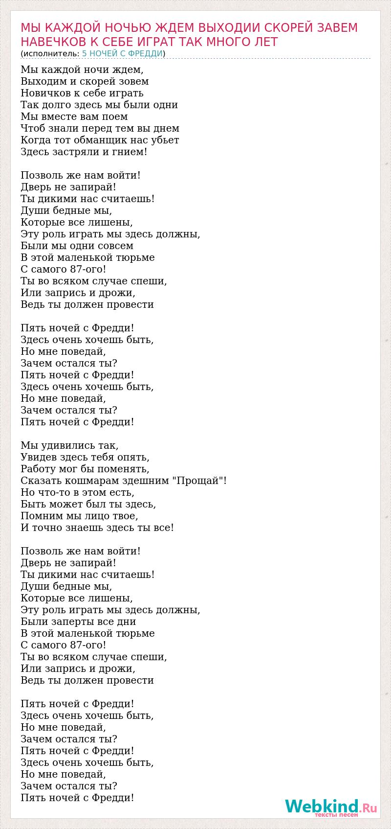 Мы каждой ночи ждем, Выходим и скорей зовем Новичков к себе играть Так долго здесь мы были одни Мы вместе вам поем Чтоб знали перед тем вы днем Когда тот обманщик нас убьет Здесь застряли и гнием! Позволь же нам войти! Дверь не запирай! Ты дикими нас считаешь! Души бедные мы, Которые все лишены, Эту роль играть мы здесь должны, Были мы одни совсем В этой маленькой тюрьме С самого 87-ого! Ты во всяком случае спеши, Или запрись и дрожи, Ведь ты должен провести Пять ночей с Фредди! Здесь очень хочешь быть, Но мне поведай, Зачем остался ты? Пять ночей с Фредди! Здесь очень хочешь быть, Но мне поведай, Зачем остался ты? Пять ночей с Фредди! Мы удивились так, Увидев здесь тебя опять, Работу мог бы поменять, Сказать кошмарам здешним "Прощай"! Но что-то в этом есть, Быть может был ты здесь, Помним мы лицо твое, И точно знаешь здесь ты все! Позволь же нам войти! Дверь не запирай! Ты дикими нас считаешь! Души бедные мы, Которые все лишены, Эту роль играть мы здесь должны, Были заперты все дни В этой маленькой тюрьме С самого 87-ого! Ты во всяком случае спеши, Или запрись и дрожи, Ведь ты должен провести Пять ночей с Фредди! Здесь очень хочешь быть, Но мне поведай, Зачем остался ты? Пять ночей с Фредди! Здесь очень хочешь быть, Но мне поведай, Зачем остался ты? Пять ночей с Фредди!