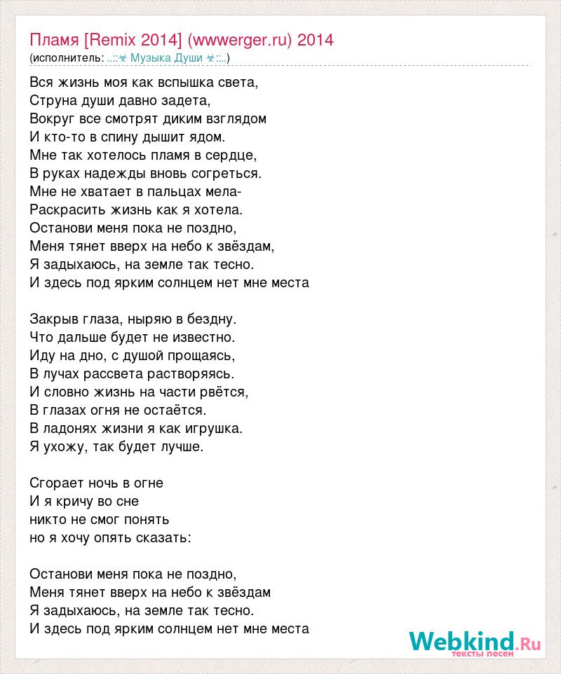 А как ты думаешь, о чем песня "Пламя [Remix 2014] (wwwerger.ru) 2014" ?