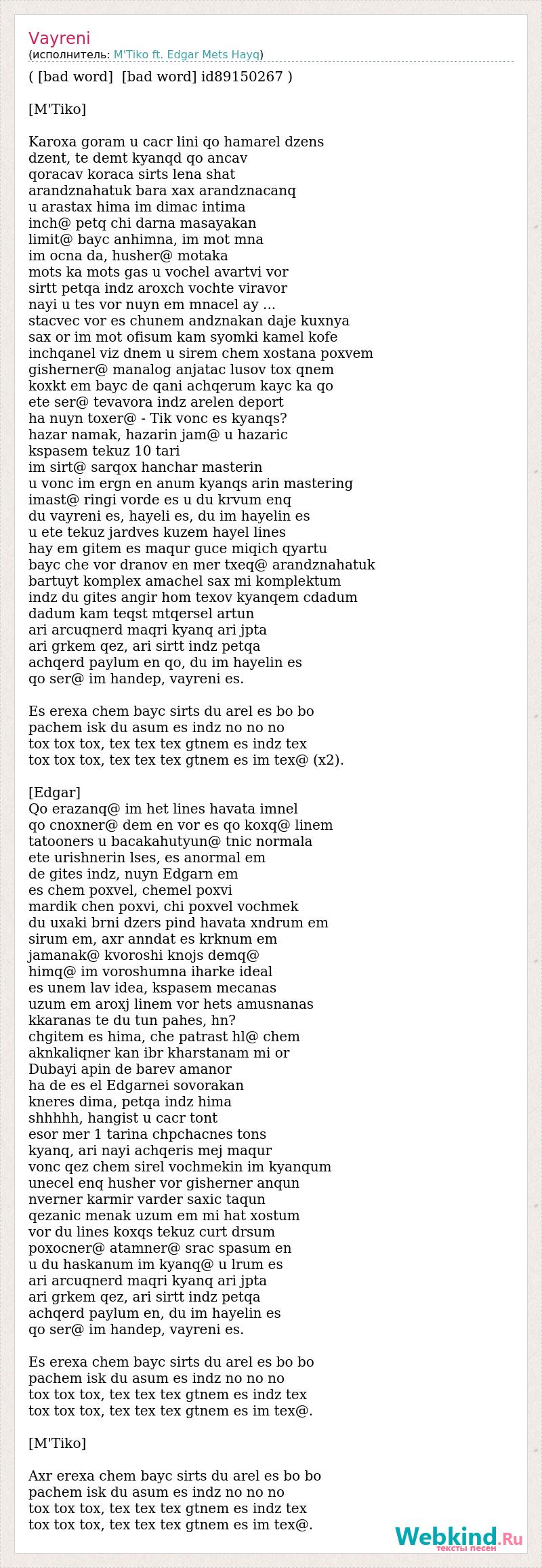 ( [bad word] [bad word] id89150267 ) [M'Tiko] Karoxa goram u cacr lini qo hamarel dzens dzent, te demt kyanqd qo ancav qoracav koraca sirts lena shat arandznahatuk bara xax arandznacanq u arastax hima im dimac intima inch@ petq chi darna masayakan limit@ bayc anhimna, im mot mna im ocna da, husher@ motaka mots ka mots gas u vochel avartvi vor sirtt petqa indz aroxch vochte viravor nayi u tes vor nuyn em mnacel ay ... stacvec vor es chunem andznakan daje kuxnya sax or im mot ofisum kam syomki kamel kofe inchqanel viz dnem u sirem chem xostana poxvem gisherner@ manalog anjatac lusov tox qnem koxkt em bayc de qani achqerum kayc ka qo ete ser@ tevavora indz arelen deport ha nuyn toxer@ - Tik vonc es kyanqs? hazar namak, hazarin jam@ u hazaric kspasem tekuz 10 tari im sirt@ sarqox hanchar masterin u vonc im ergn en anum kyanqs arin mastering imast@ ringi vorde es u du krvum enq du vayreni es, hayeli es, du im hayelin es u ete tekuz jardves kuzem hayel lines hay em gitem es maqur guce miqich qyartu bayc che vor dranov en mer txeq@ arandznahatuk bartuyt komplex amachel sax mi komplektum indz du gites angir hom texov kyanqem cdadum dadum kam teqst mtqersel artun ari arcuqnerd maqri kyanq ari jpta ari grkem qez, ari sirtt indz petqa achqerd paylum en qo, du im hayelin es qo ser@ im handep, vayreni es. Es erexa chem bayc sirts du arel es bo bo pachem isk du asum es indz no no no tox tox tox, tex tex tex gtnem es indz tex tox tox tox, tex tex tex gtnem es im tex@ (x2). [Edgar] Qo erazanq@ im het lines havata imnel qo cnoxner@ dem en vor es qo koxq@ linem tatooners u bacakahutyun@ tnic normala ete urishnerin lses, es anormal em de gites indz, nuyn Edgarn em es chem poxvel, chemel poxvi mardik chen poxvi, chi poxvel vochmek du uxaki brni dzers pind havata xndrum em sirum em, axr anndat es krknum em jamanak@ kvoroshi knojs demq@ himq@ im voroshumna iharke ideal es unem lav idea, kspasem mecanas uzum em aroxj linem vor hets amusnanas kkaranas te du tun pahes, hn? chgitem es hima, che patrast hl@ chem aknkaliqner kan ibr kharstanam mi or Dubayi apin de barev amanor ha de es el Edgarnei sovorakan kneres dima, petqa indz hima shhhhh, hangist u cacr tont esor mer 1 tarina chpchacnes tons kyanq, ari nayi achqeris mej maqur vonc qez chem sirel vochmekin im kyanqum unecel enq husher vor gisherner anqun nverner karmir varder saxic taqun qezanic menak uzum em mi hat xostum vor du lines koxqs tekuz curt drsum poxocner@ atamner@ srac spasum en u du haskanum im kyanq@ u lrum es ari arcuqnerd maqri kyanq ari jpta ari grkem qez, ari sirtt indz petqa achqerd paylum en, du im hayelin es qo ser@ im handep, vayreni es. Es erexa chem bayc sirts du arel es bo bo pachem isk du asum es indz no no no tox tox tox, tex tex tex gtnem es indz tex tox tox tox, tex tex tex gtnem es im tex@. [M'Tiko] Axr erexa chem bayc sirts du arel es bo bo pachem isk du asum es indz no no no tox tox tox, tex tex tex gtnem es indz tex tox tox tox, tex tex tex gtnem es im tex@.
