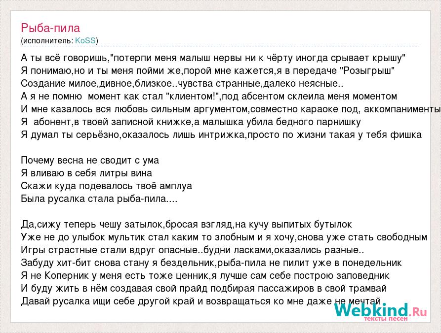 А ты всё говоришь,"потерпи меня малыш нервы ни к чёрту иногда срывает крышу" Я понимаю,но и ты меня пойми же,порой мне кажется,я в передаче "Розыгрыш" Создание милое,дивное,близкое..чувства странные,далеко неясные.. А я не помню момент как стал "клиентом!",под абсентом склеила меня моментом И мне казалось вся любовь сильным аргументом,совместно караоке под, аккомпанименты Я абонент,в твоей записной книжке,а малышка убила бедного парнишку Я думал ты серьёзно,оказалось лишь интрижка,просто по жизни такая у тебя фишка Почему весна не сводит с ума Я вливаю в себя литры вина Скажи куда подевалось твоё амплуа Была русалка стала рыба-пила.... Да,сижу теперь чешу затылок,бросая взгляд,на кучу выпитых бутылок Уже не до улыбок мультик стал каким то злобным и я хочу,снова уже стать свободным Игры страстные стали вдруг опасные..будни ласками,оказались разные.. Забуду хит-бит снова стану я бездельник,рыба-пила не пилит уже в понедельник Я не Коперник у меня есть тоже ценник,я лучше сам себе построю заповедник И буду жить в нём создавая свой прайд подбирая пассажиров в свой трамвай Давай русалка ищи себе другой край и возвращаться ко мне даже не мечтай