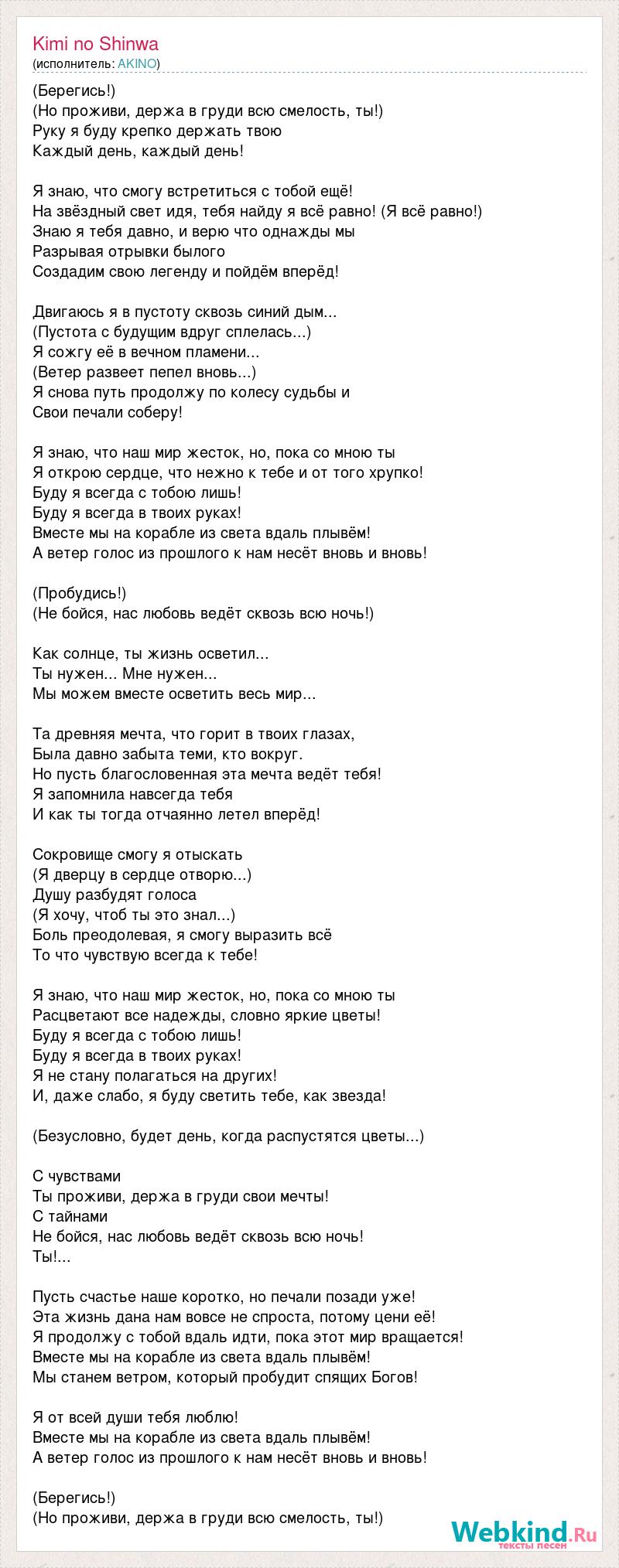 (Берегись!) (Но проживи, держа в груди всю смелость, ты!) Руку я буду крепко держать твою Каждый день, каждый день! Я знаю, что смогу встретиться с тобой ещё! На звёздный свет идя, тебя найду я всё равно! (Я всё равно!) Знаю я тебя давно, и верю что однажды мы Разрывая отрывки былого Создадим свою легенду и пойдём вперёд! Двигаюсь я в пустоту сквозь синий дым... (Пустота с будущим вдруг сплелась...) Я сожгу её в вечном пламени... (Ветер развеет пепел вновь...) Я снова путь продолжу по колесу судьбы и Свои печали соберу! Я знаю, что наш мир жесток, но, пока со мною ты Я открою сердце, что нежно к тебе и от того хрупко! Буду я всегда с тобою лишь! Буду я всегда в твоих руках! Вместе мы на корабле из света вдаль плывём! А ветер голос из прошлого к нам несёт вновь и вновь! (Пробудись!) (Не бойся, нас любовь ведёт сквозь всю ночь!) Как солнце, ты жизнь осветил... Ты нужен... Мне нужен... Мы можем вместе осветить весь мир... Та древняя мечта, что горит в твоих глазах, Была давно забыта теми, кто вокруг. Но пусть благословенная эта мечта ведёт тебя! Я запомнила навсегда тебя И как ты тогда отчаянно летел вперёд! Сокровище смогу я отыскать (Я дверцу в сердце отворю...) Душу разбудят голоса (Я хочу, чтоб ты это знал...) Боль преодолевая, я смогу выразить всё То что чувствую всегда к тебе! Я знаю, что наш мир жесток, но, пока со мною ты Расцветают все надежды, словно яркие цветы! Буду я всегда с тобою лишь! Буду я всегда в твоих руках! Я не стану полагаться на других! И, даже слабо, я буду светить тебе, как звезда! (Безусловно, будет день, когда распустятся цветы...) С чувствами Ты проживи, держа в груди свои мечты! С тайнами Не бойся, нас любовь ведёт сквозь всю ночь! Ты!... Пусть счастье наше коротко, но печали позади уже! Эта жизнь дана нам вовсе не спроста, потому цени её! Я продолжу с тобой вдаль идти, пока этот мир вращается! Вместе мы на корабле из света вдаль плывём! Мы станем ветром, который пробудит спящих Богов! Я от всей души тебя люблю! Вместе мы на корабле из света вдаль плывём! А ветер голос из прошлого к нам несёт вновь и вновь! (Берегись!) (Но проживи, держа в груди всю смелость, ты!)