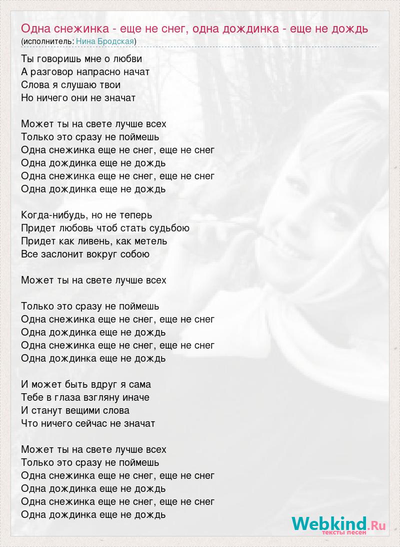 Ты говоришь мне о любви А разговор напрасно начат Слова я слушаю твои Но ничего они не значат Может ты на свете лучше всех Только это сразу не поймешь Одна снежинка еще не снег, еще не снег Одна дождинка еще не дождь Одна снежинка еще не снег, еще не снег Одна дождинка еще не дождь Когда-нибудь, но не теперь Придет любовь чтоб стать судьбою Придет как ливень, как метель Все заслонит вокруг собою Может ты на свете лучше всех Только это сразу не поймешь Одна снежинка еще не снег, еще не снег Одна дождинка еще не дождь Одна снежинка еще не снег, еще не снег Одна дождинка еще не дождь И может быть вдруг я сама Тебе в глаза взгляну иначе И станут вещими слова Что ничего сейчас не значат Может ты на свете лучше всех Только это сразу не поймешь Одна снежинка еще не снег, еще не снег Одна дождинка еще не дождь Одна снежинка еще не снег, еще не снег Одна дождинка еще не дождь