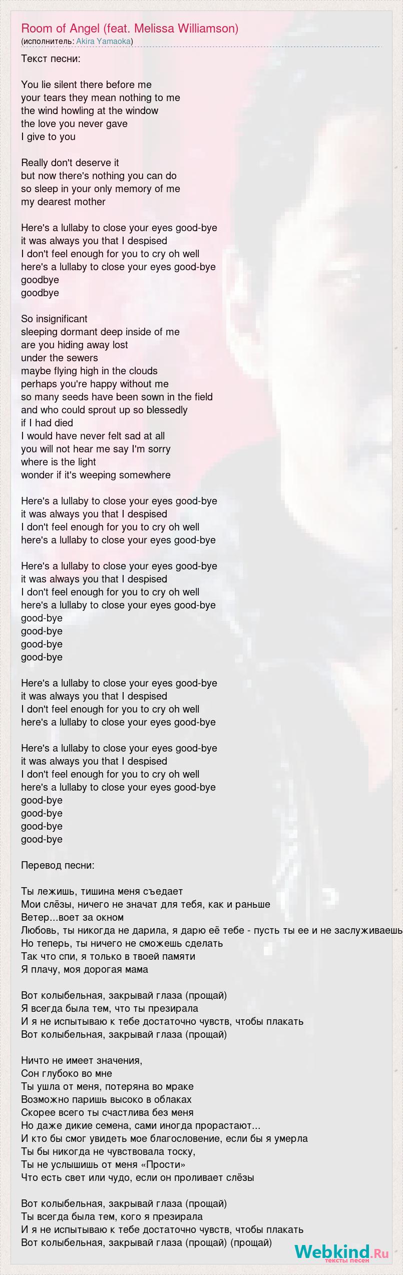 Текст песни: You lie silent there before me your tears they mean nothing to me the wind howling at the window the love you never gave I give to you Really don't deserve it but now there's nothing you can do so sleep in your only memory of me my dearest mother Here's a lullaby to close your eyes good-bye it was always you that I despised I don't feel enough for you to cry oh well here's a lullaby to close your eyes good-bye goodbye goodbye So insignificant sleeping dormant deep inside of me are you hiding away lost under the sewers maybe flying high in the clouds perhaps you're happy without me so many seeds have been sown in the field and who could sprout up so blessedly if I had died I would have never felt sad at all you will not hear me say I'm sorry where is the light wonder if it's weeping somewhere Here's a lullaby to close your eyes good-bye it was always you that I despised I don't feel enough for you to cry oh well here's a lullaby to close your eyes good-bye Here's a lullaby to close your eyes good-bye it was always you that I despised I don't feel enough for you to cry oh well here's a lullaby to close your eyes good-bye good-bye good-bye good-bye good-bye Here's a lullaby to close your eyes good-bye it was always you that I despised I don't feel enough for you to cry oh well here's a lullaby to close your eyes good-bye Here's a lullaby to close your eyes good-bye it was always you that I despised I don't feel enough for you to cry oh well here's a lullaby to close your eyes good-bye good-bye good-bye good-bye good-bye Перевод песни: Ты лежишь, тишина меня съедает Мои слёзы, ничего не значат для тебя, как и раньше Ветер...воет за окном Любовь, ты никогда не дарила, я дарю её тебе - пусть ты ее и не заслуживаешь Но теперь, ты ничего не сможешь сделать Так что спи, я только в твоей памяти Я плачу, моя дорогая мама Вот колыбельная, закрывай глаза (прощай) Я всегда была тем, что ты презирала И я не испытываю к тебе достаточно чувств, чтобы плакать Вот колыбельная, закрывай глаза (прощай) Ничто не имеет значения, Сон глубоко во мне Ты ушла от меня, потеряна во мраке Возможно паришь высоко в облаках Скорее всего ты счастлива без меня Но даже дикие семена, сами иногда прорастают... И кто бы смог увидеть мое благословение, если бы я умерла Ты бы никогда не чувствовала тоску, Ты не услышишь от меня «Прости» Что есть свет или чудо, если он проливает слёзы Вот колыбельная, закрывай глаза (прощай) Ты всегда была тем, кого я презирала И я не испытываю к тебе достаточно чувств, чтобы плакать Вот колыбельная, закрывай глаза (прощай) (прощай)