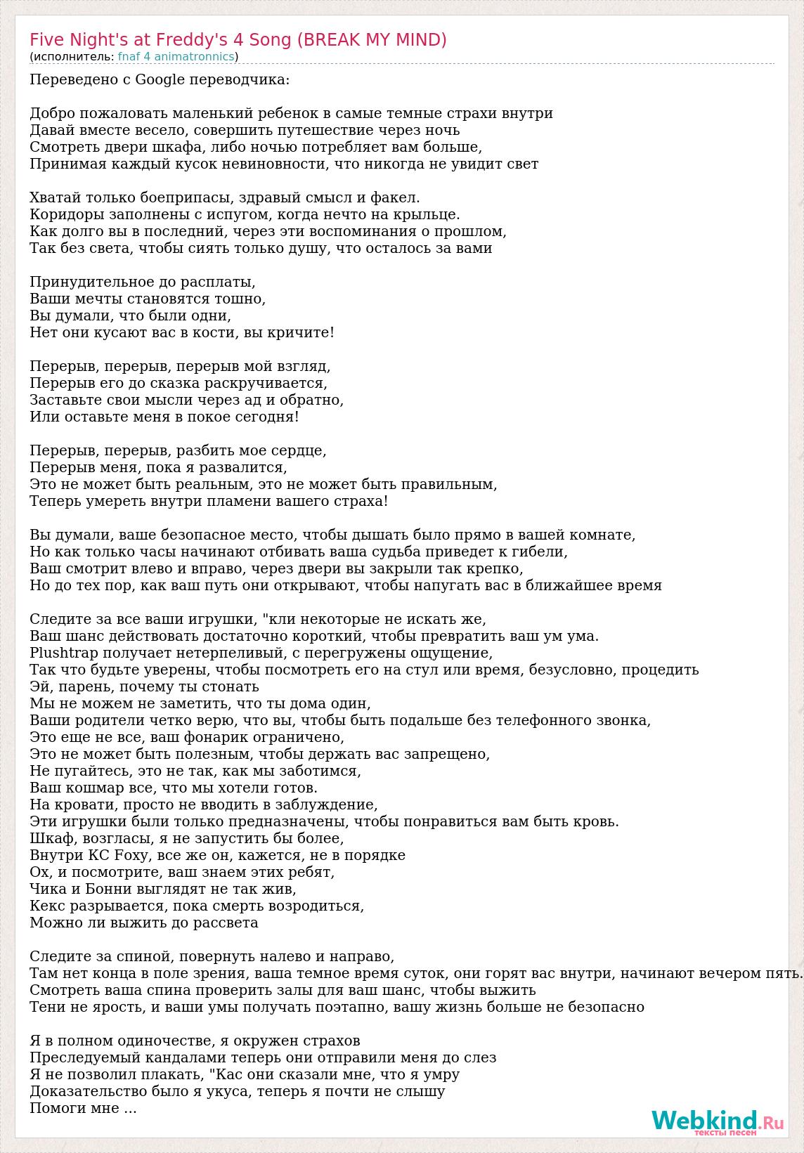 Переведено с Google переводчика: Добро пожаловать маленький ребенок в самые темные страхи внутри Давай вместе весело, совершить путешествие через ночь Смотреть двери шкафа, либо ночью потребляет вам больше, Принимая каждый кусок невиновности, что никогда не увидит свет Хватай только боеприпасы, здравый смысл и факел. Коридоры заполнены с испугом, когда нечто на крыльце. Как долго вы в последний, через эти воспоминания о прошлом, Так без света, чтобы сиять только душу, что осталось за вами Принудительное до расплаты, Ваши мечты становятся тошно, Вы думали, что были одни, Нет они кусают вас в кости, вы кричите! Перерыв, перерыв, перерыв мой взгляд, Перерыв его до сказка раскручивается, Заставьте свои мысли через ад и обратно, Или оставьте меня в покое сегодня! Перерыв, перерыв, разбить мое сердце, Перерыв меня, пока я развалится, Это не может быть реальным, это не может быть правильным, Теперь умереть внутри пламени вашего страха! Вы думали, ваше безопасное место, чтобы дышать было прямо в вашей комнате, Но как только часы начинают отбивать ваша судьба приведет к гибели, Ваш смотрит влево и вправо, через двери вы закрыли так крепко, Но до тех пор, как ваш путь они открывают, чтобы напугать вас в ближайшее время Следите за все ваши игрушки, "кли некоторые не искать же, Ваш шанс действовать достаточно короткий, чтобы превратить ваш ум ума. Plushtrap получает нетерпеливый, с перегружены ощущение, Так что будьте уверены, чтобы посмотреть его на стул или время, безусловно, процедить Эй, парень, почему ты стонать Мы не можем не заметить, что ты дома один, Ваши родители четко верю, что вы, чтобы быть подальше без телефонного звонка, Это еще не все, ваш фонарик ограничено, Это не может быть полезным, чтобы держать вас запрещено, Не пугайтесь, это не так, как мы заботимся, Ваш кошмар все, что мы хотели готов. На кровати, просто не вводить в заблуждение, Эти игрушки были только предназначены, чтобы понравиться вам быть кровь. Шкаф, возгласы, я не запустить бы более, Внутри КС Foxy, все же он, кажется, не в порядке Ох, и посмотрите, ваш знаем этих ребят, Чика и Бонни выглядят не так жив, Кекс разрывается, пока смерть возродиться, Можно ли выжить до рассвета Следите за спиной, повернуть налево и направо, Там нет конца в поле зрения, ваша темное время суток, они горят вас внутри, начинают вечером пять. Смотреть ваша спина проверить залы для ваш шанс, чтобы выжить Тени не ярость, и ваши умы получать поэтапно, вашу жизнь больше не безопасно Я в полном одиночестве, я окружен страхов Преследуемый кандалами теперь они отправили меня до слез Я не позволил плакать, "Кас они сказали мне, что я умру Доказательство было я укуса, теперь я почти не слышу Помоги мне ...