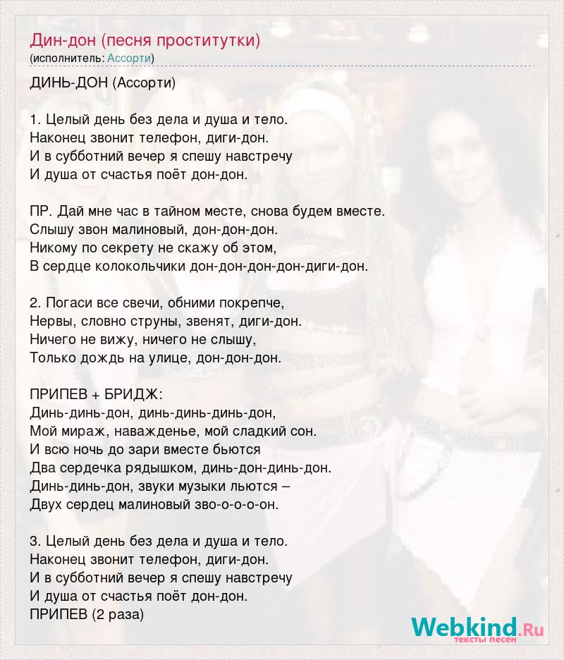 ДИНЬ-ДОН (Ассорти) 1. Целый день без дела и душа и тело. Наконец звонит телефон, диги-дон. И в субботний вечер я спешу навстречу И душа от счастья поёт дон-дон. ПР. Дай мне час в тайном месте, снова будем вместе. Слышу звон малиновый, дон-дон-дон. Никому по секрету не скажу об этом, В сердце колокольчики дон-дон-дон-дон-диги-дон. 2. Погаси все свечи, обними покрепче, Нервы, словно струны, звенят, диги-дон. Ничего не вижу, ничего не слышу, Только дождь на улице, дон-дон-дон. ПРИПЕВ + БРИДЖ: Динь-динь-дон, динь-динь-динь-дон, Мой мираж, наважденье, мой сладкий сон. И всю ночь до зари вместе бьются Два сердечка рядышком, динь-дон-динь-дон. Динь-динь-дон, звуки музыки льются – Двух сердец малиновый зво-о-о-о-он. 3. Целый день без дела и душа и тело. Наконец звонит телефон, диги-дон. И в субботний вечер я спешу навстречу И душа от счастья поёт дон-дон. ПРИПЕВ (2 раза)
