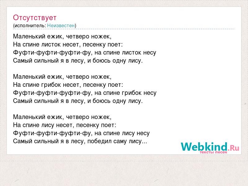 Маленький ежик, четверо ножек, На спине листок несет, песенку поет: Фуфти-фуфти-фуфти-фу, на спине листок несу Самый сильный я в лесу, и боюсь одну лису. Маленький ежик, четверо ножек, На спине грибок несет, песенку поет: Фуфти-фуфти-фуфти-фу, на спине грибок несу Самый сильный я в лесу, и боюсь одну лису. Маленький ежик, четверо ножек, На спине лису несет, песенку поет: Фуфти-фуфти-фуфти-фу, на спине лису несу Самый сильный я в лесу, победил саму лису...