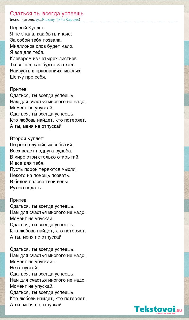 Первый Куплет: Я не знала, как быть иначе. За собой тебя позвала. Миллионов слов будет мало. Я вся для тебя. Клевером из четырех листьев. Ты вошел, как будто из скал. Наизусть в признаниях, мыслях. Шепчу про себя. Припев: Сдаться, ты всегда успеешь. Нам для счастья многого не надо. Момент не упускай. Сдаться, ты всегда успеешь. Кто любовь найдет, кто потеряет. А ты, меня не отпускай. Второй Куплет: По реке случайных событий. Всех ведет подруга-судьба. В мире этом столько открытий. И все для тебя. Пусть порой теряются мысли. Некого на помощь позвать. В белой полосе твои вены. Рукою подать. Припев: Сдаться, ты всегда успеешь. Нам для счастья многого не надо. Момент не упускай. Сдаться, ты всегда успеешь. Кто любовь найдет, кто потеряет. А ты, меня не отпускай. Сдаться, ты всегда успеешь. Нам для счастья многого не надо. Момент не упускай… Не отпускай. Сдаться, ты всегда успеешь. Нам для счастья многого не надо. Момент не упускай. Сдаться, ты всегда успеешь. Кто любовь найдет, кто потеряет. А ты, меня не отпускай.