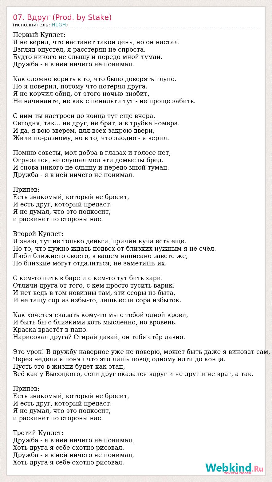 Первый Куплет: Я не верил, что настанет такой день, но он настал. Взгляд опустел, я расстерян не спроста. Будто никого не слышу и передо мной туман. Дружба - я в ней ничего не понимал. Как сложно верить в то, что было доверять глупо. Но я поверил, потому что потерял друга. Я не корчил обид, от этого ночью знобит, Не начинайте, не как с пенальти тут - не проще забить. С ним ты настроен до конца тут еще вчера. Сегодня, так... не друг, не брат, а в трубке номера. И да, я вою зверем, для всех закрою двери, Жили по-разному, но в то, что заодно - я верил. Помню советы, мол добра в глазах и голосе нет, Огрызался, не слушал мол эти домыслы бред. И снова никого не слышу и передо мной туман. Дружба - я в ней ничего не понимал. Припев: Есть знакомый, который не бросит, И есть друг, который предаст. Я не думал, что это подкосит, и раскинет по стороны нас. Второй Куплет: Я знаю, тут не только деньги, причин куча есть еще. Но то, что нужно ждать подвох от близких нужным я не счёл. Люби ближнего своего, в вашем написано завете же, Но близкие могут отдалиться, не заметишь их. С кем-то пить в баре и с кем-то тут бить хари. Отличи друга от того, с кем просто тусить варик. И нет ведь в том новизны там, эти ссоры из быта, И не тащу сор из избы-то, лишь если сора избыток. Как хочется сказать кому-то мы с тобой одной крови, И быть бы с близкими хоть мысленно, но вровень. Краска врастёт в пано. Нарисовал друга? Стирай давай, он тебя стёр давно. Это урок! В дружбу наверное уже не поверю, может быть даже я виноват сам, Через недели я понял что это лишь повод одному идти до конца. Пусть это в жизни будет как этап, Всё как у Высоцкого, если друг оказался вдруг и не друг и не враг, а так. Припев: Есть знакомый, который не бросит, И есть друг, который предаст. Я не думал, что это подкосит, и раскинет по стороны нас. Третий Куплет: Дружба - я в ней ничего не понимал, Хоть друга я себе охотно рисовал. Дружба - я в ней ничего не понимал, Хоть друга я себе охотно рисовал.