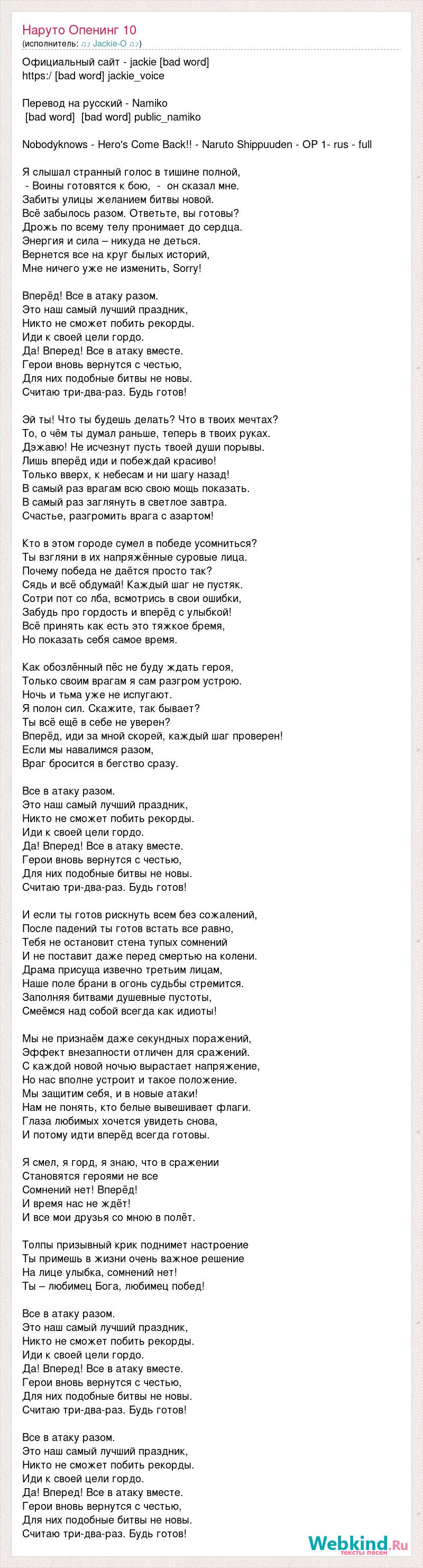 Официальный сайт - jackie [bad word] https:/ [bad word] jackie_voice Перевод на русский - Namiko [bad word] [bad word] public_namiko Nobodyknows - Hero's Come Back!! - Naruto Shippuuden - OP 1- rus - full Я слышал странный голос в тишине полной, - Воины готовятся к бою, - он сказал мне. Забиты улицы желанием битвы новой. Всё забылось разом. Ответьте, вы готовы? Дрожь по всему телу пронимает до сердца. Энергия и сила – никуда не деться. Вернется все на круг былых историй, Мне ничего уже не изменить, Sorry! Вперёд! Все в атаку разом. Это наш самый лучший праздник, Никто не сможет побить рекорды. Иди к своей цели гордо. Да! Вперед! Все в атаку вместе. Герои вновь вернутся с честью, Для них подобные битвы не новы. Считаю три-два-раз. Будь готов! Эй ты! Что ты будешь делать? Что в твоих мечтах? То, о чём ты думал раньше, теперь в твоих руках. Дэжавю! Не исчезнут пусть твоей души порывы. Лишь вперёд иди и побеждай красиво! Только вверх, к небесам и ни шагу назад! В самый раз врагам всю свою мощь показать. В самый раз заглянуть в светлое завтра. Счастье, разгромить врага с азартом! Кто в этом городе сумел в победе усомниться? Ты взгляни в их напряжённые суровые лица. Почему победа не даётся просто так? Сядь и всё обдумай! Каждый шаг не пустяк. Сотри пот со лба, всмотрись в свои ошибки, Забудь про гордость и вперёд с улыбкой! Всё принять как есть это тяжкое бремя, Но показать себя самое время. Как обозлённый пёс не буду ждать героя, Только своим врагам я сам разгром устрою. Ночь и тьма уже не испугают. Я полон сил. Скажите, так бывает? Ты всё ещё в себе не уверен? Вперёд, иди за мной скорей, каждый шаг проверен! Если мы навалимся разом, Враг бросится в бегство сразу. Все в атаку разом. Это наш самый лучший праздник, Никто не сможет побить рекорды. Иди к своей цели гордо. Да! Вперед! Все в атаку вместе. Герои вновь вернутся с честью, Для них подобные битвы не новы. Считаю три-два-раз. Будь готов! И если ты готов рискнуть всем без сожалений, После падений ты готов встать все равно, Тебя не остановит стена тупых сомнений И не поставит даже перед смертью на колени. Драма присуща извечно третьим лицам, Наше поле брани в огонь судьбы стремится. Заполняя битвами душевные пустоты, Смеёмся над собой всегда как идиоты! Мы не признаём даже секундных поражений, Эффект внезапности отличен для сражений. С каждой новой ночью вырастает напряжение, Но нас вполне устроит и такое положение. Мы защитим себя, и в новые атаки! Нам не понять, кто белые вывешивает флаги. Глаза любимых хочется увидеть снова, И потому идти вперёд всегда готовы. Я смел, я горд, я знаю, что в сражении Становятся героями не все Сомнений нет! Вперёд! И время нас не ждёт! И все мои друзья со мною в полёт. Толпы призывный крик поднимет настроение Ты примешь в жизни очень важное решение На лице улыбка, сомнений нет! Ты – любимец Бога, любимец побед! Все в атаку разом. Это наш самый лучший праздник, Никто не сможет побить рекорды. Иди к своей цели гордо. Да! Вперед! Все в атаку вместе. Герои вновь вернутся с честью, Для них подобные битвы не новы. Считаю три-два-раз. Будь готов! Все в атаку разом. Это наш самый лучший праздник, Никто не сможет побить рекорды. Иди к своей цели гордо. Да! Вперед! Все в атаку вместе. Герои вновь вернутся с честью, Для них подобные битвы не новы. Считаю три-два-раз. Будь готов!