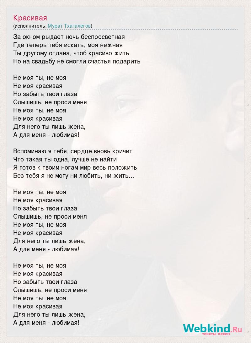 За окном рыдает ночь беспросветная Где теперь тебя искать, моя нежная Ты другому отдана, чтоб красиво жить Но на свадьбу не смогли счастья подарить Не моя ты, не моя Не моя красивая Но забыть твои глаза Слышишь, не проси меня Не моя ты, не моя Не моя красивая Для него ты лишь жена, А для меня - любимая! Вспоминаю я тебя, сердце вновь кричит Что такая ты одна, лучше не найти Я готов к твоим ногам мир весь положить Без тебя я не могу ни любить, ни жить... Не моя ты, не моя Не моя красивая Но забыть твои глаза Слышишь, не проси меня Не моя ты, не моя Не моя красивая Для него ты лишь жена, А для меня - любимая! Не моя ты, не моя Не моя красивая Но забыть твои глаза Слышишь, не проси меня Не моя ты, не моя Не моя красивая Для него ты лишь жена, А для меня - любимая!