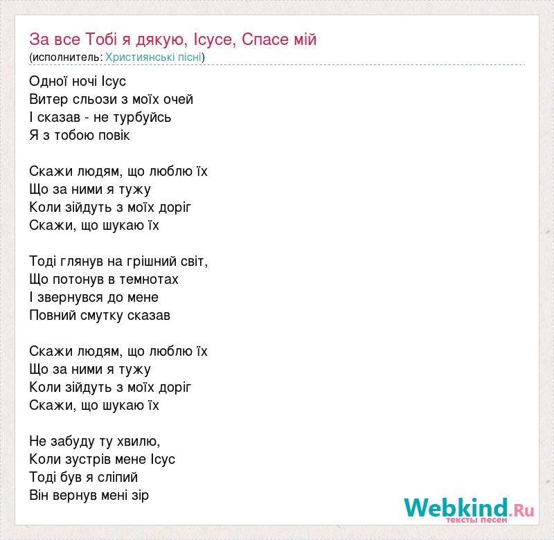 Одної ночі Ісус Витер сльози з моїх очей І сказав - не турбуйсь Я з тобою повік Скажи людям, що люблю їх Що за ними я тужу Коли зійдуть з моїх доріг Скажи, що шукаю їх Тоді глянув на грішний світ, Що потонув в темнотах І звернувся до мене Повний смутку сказав Скажи людям, що люблю їх Що за ними я тужу Коли зійдуть з моїх доріг Скажи, що шукаю їх Не забуду ту хвилю, Коли зустрів мене Ісус Тоді був я сліпий Він вернув мені зір