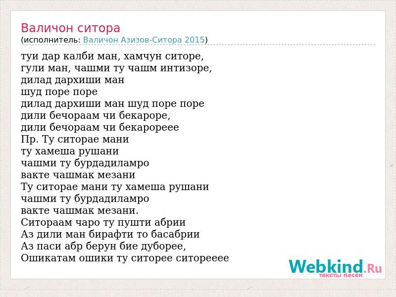 туи дар калби ман, хамчун ситоре, гули ман, чашми ту чашм интизоре, дилад дархиши ман шуд поре поре дилад дархиши ман шуд поре поре дили бечораам чи бекароре, дили бечораам чи бекарореее Пр. Ту ситорае мани ту хамеша рушани чашми ту бурдадиламро вакте чашмак мезани Ту ситорае мани ту хамеша рушани чашми ту бурдадиламро вакте чашмак мезани. Ситораам чаро ту пушти абрии Аз дили ман бирафти то басабрии Аз паси абр берун бие дуборее, Ошикатам ошики ту ситорее ситорееее