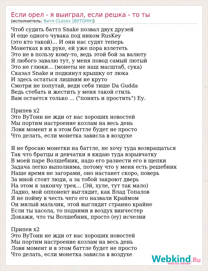 А как ты думаешь, о чем песня "Если орел - я выиграл, если решка - то ты" ?