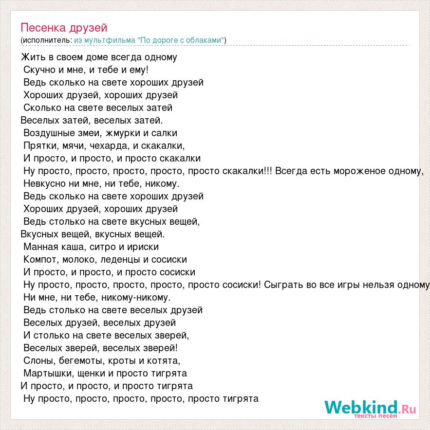 Жить в своем доме всегда одному Скучно и мне, и тебе и ему! Ведь сколько на свете хороших друзей Хороших друзей, хороших друзей Сколько на свете веселых затей Веселых затей, веселых затей. Воздушные змеи, жмурки и салки Прятки, мячи, чехарда, и скакалки, И просто, и просто, и просто скакалки Ну просто, просто, просто, просто, просто скакалки!!! Всегда есть мороженое одному, Невкусно ни мне, ни тебе, никому. Ведь сколько на свете хороших друзей Хороших друзей, хороших друзей Ведь столько на свете вкусных вещей, Вкусных вещей, вкусных вещей. Манная каша, ситро и ириски Компот, молоко, леденцы и сосиски И просто, и просто, и просто сосиски Ну просто, просто, просто, просто, просто сосиски! Сыграть во все игры нельзя одному Ни мне, ни тебе, никому-никому. Ведь столько на свете веселых друзей Веселых друзей, веселых друзей И столько на свете веселых зверей, Веселых зверей, веселых зверей! Слоны, бегемоты, кроты и котята, Мартышки, щенки и просто тигрята И просто, и просто, и просто тигрята Ну просто, просто, просто, просто, просто тигрята