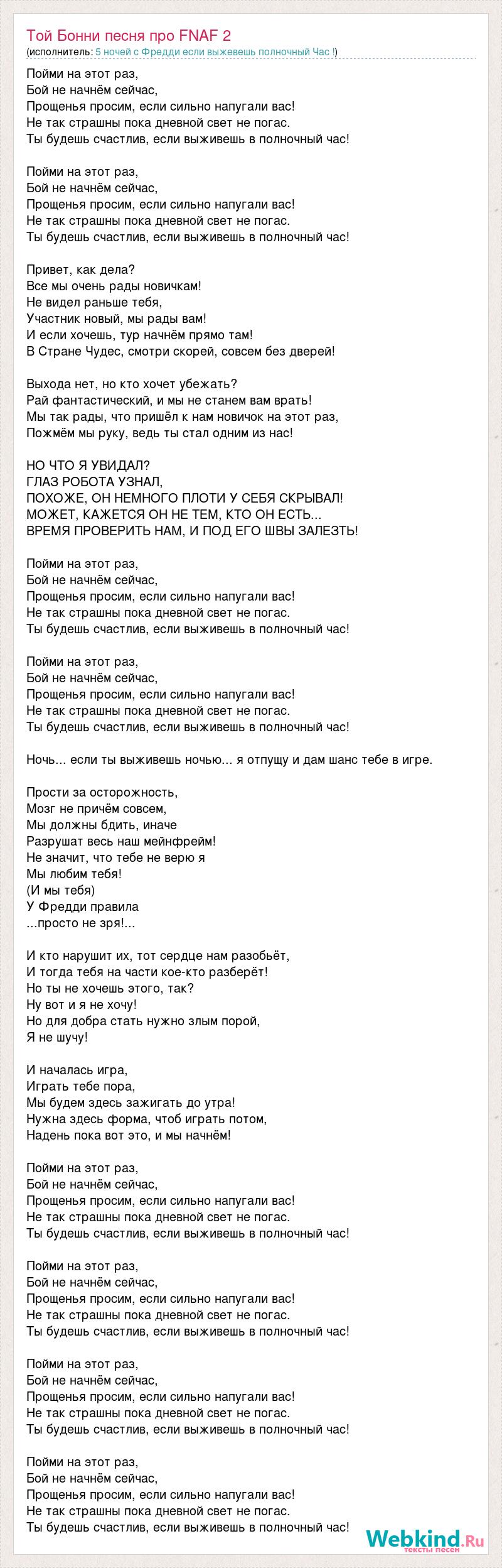 Пойми на этот раз, Бой не начнём сейчас, Прощенья просим, если сильно напугали вас! Не так страшны пока дневной свет не погас. Ты будешь счастлив, если выживешь в полночный час! Пойми на этот раз, Бой не начнём сейчас, Прощенья просим, если сильно напугали вас! Не так страшны пока дневной свет не погас. Ты будешь счастлив, если выживешь в полночный час! Привет, как дела? Все мы очень рады новичкам! Не видел раньше тебя, Участник новый, мы рады вам! И если хочешь, тур начнём прямо там! В Стране Чудес, смотри скорей, совсем без дверей! Выхода нет, но кто хочет убежать? Рай фантастический, и мы не станем вам врать! Мы так рады, что пришёл к нам новичок на этот раз, Пожмём мы руку, ведь ты стал одним из нас! НО ЧТО Я УВИДАЛ? ГЛАЗ РОБОТА УЗНАЛ, ПОХОЖЕ, ОН НЕМНОГО ПЛОТИ У СЕБЯ СКРЫВАЛ! МОЖЕТ, КАЖЕТСЯ ОН НЕ ТЕМ, КТО ОН ЕСТЬ... ВРЕМЯ ПРОВЕРИТЬ НАМ, И ПОД ЕГО ШВЫ ЗАЛЕЗТЬ! Пойми на этот раз, Бой не начнём сейчас, Прощенья просим, если сильно напугали вас! Не так страшны пока дневной свет не погас. Ты будешь счастлив, если выживешь в полночный час! Пойми на этот раз, Бой не начнём сейчас, Прощенья просим, если сильно напугали вас! Не так страшны пока дневной свет не погас. Ты будешь счастлив, если выживешь в полночный час! Ночь... если ты выживешь ночью... я отпущу и дам шанс тебе в игре. Прости за осторожность, Мозг не причём совсем, Мы должны бдить, иначе Разрушат весь наш мейнфрейм! Не значит, что тебе не верю я Мы любим тебя! (И мы тебя) У Фредди правила ...просто не зря!... И кто нарушит их, тот сердце нам разобьёт, И тогда тебя на части кое-кто разберёт! Но ты не хочешь этого, так? Ну вот и я не хочу! Но для добра стать нужно злым порой, Я не шучу! И началась игра, Играть тебе пора, Мы будем здесь зажигать до утра! Нужна здесь форма, чтоб играть потом, Надень пока вот это, и мы начнём! Пойми на этот раз, Бой не начнём сейчас, Прощенья просим, если сильно напугали вас! Не так страшны пока дневной свет не погас. Ты будешь счастлив, если выживешь в полночный час! Пойми на этот раз, Бой не начнём сейчас, Прощенья просим, если сильно напугали вас! Не так страшны пока дневной свет не погас. Ты будешь счастлив, если выживешь в полночный час! Пойми на этот раз, Бой не начнём сейчас, Прощенья просим, если сильно напугали вас! Не так страшны пока дневной свет не погас. Ты будешь счастлив, если выживешь в полночный час! Пойми на этот раз, Бой не начнём сейчас, Прощенья просим, если сильно напугали вас! Не так страшны пока дневной свет не погас. Ты будешь счастлив, если выживешь в полночный час!