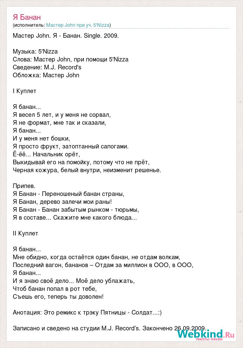 Мастер John. Я - Банан. Single. 2009. Музыка: 5'Nizza Слова: Мастер John, при помощи 5'Nizza Сведение: M.J. Record's Обложка: Мастер John I Куплет Я банан... Я весел 5 лет, и у меня не сорвал, Я не формат, мне так и сказали, Я банан... И у меня нет бошки, Я просто фрукт, затоптанный сапогами. Ё-ёё... Начальник орёт, Выкидывай его на помойку, потому что не прёт, Черная кожура, белый внутри, неизменит решенье. Припев. Я Банан - Переношеный банан страны, Я Банан, дерево залечи мои раны! Я Банан - Банан забытым рынком - тюрьмы, Я в составе... Скажите мне какого блюда... II Куплет Я банан... Мне обидно, когда остаётся один банан, не отдам волкам, Последний вагон, бананов – Отдам за миллион в ООО, в ООО, Я банан... И я знаю своё дело... Моё дело ублажать, Чтоб банан попал в рот тебе, Съешь его, теперь ты доволен! Анотация: Это ремикс к трэку Пятницы - Солдат...:) Записано и сведено на студии M.J. Record’s. Закончено 26.09.2009.