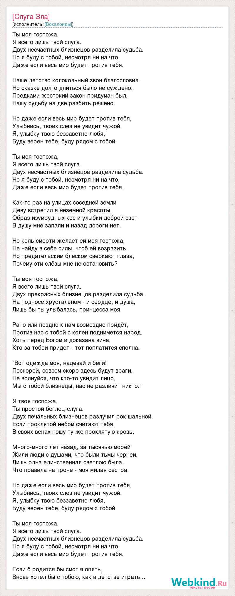Ты моя госпожа, Я всего лишь твой слуга. Двух несчастных близнецов разделила судьба. Но я буду с тобой, несмотря ни на что, Даже если весь мир будет против тебя. Наше детство колокольный звон благословил. Но сказке долго длиться было не суждено. Предками жестокий закон придуман был, Нашу судьбу на две разбить решено. Но даже если весь мир будет против тебя, Улыбнись, твоих слез не увидит чужой. Я, улыбку твою беззаветно любя, Буду верен тебе, буду рядом с тобой. Ты моя госпожа, Я всего лишь твой слуга. Двух несчастных близнецов разделила судьба. Но я буду с тобой, несмотря ни на что, Даже если весь мир будет против тебя. Как-то раз на улицах соседней земли Деву встретил я неземной красоты. Образ изумрудных кос и улыбки доброй свет В душу мне запали и назад дороги нет. Но коль смерти желает ей моя госпожа, Не найду в себе силы, чтоб ей возразить. Но предательским блеском сверкают глаза, Почему эти слёзы мне не остановить? Ты моя госпожа, Я всего лишь твой слуга. Двух прекрасных близнецов разделила судьба. На подносе хрустальном - и сердце, и душа, Лишь бы ты улыбалась, принцесса моя. Рано или поздно к нам возмездие придёт, Против нас с тобой с колен поднимется народ. Хоть перед Богом и доказана вина, Кто за тобой придет - тот поплатится сполна. "Вот одежда моя, надевай и беги! Поскорей, совсем скоро здесь будут враги. Не волнуйся, что кто-то увидит лицо, Мы с тобой близнецы, нас не различит никто." Я твоя госпожа, Ты простой беглец-слуга. Двух печальных близнецов разлучил рок шальной. Если проклятой небом считают тебя, В своих венах ношу ту же проклятую кровь. Много-много лет назад, за тысячью морей Жили люди с душами, что были тьмы черней. Лишь одна единственная светлою была, Что правила на троне - моя милая сестра. Но даже если весь мир будет против тебя, Улыбнись, твоих слез не увидит чужой. Я, улыбку твою беззаветно любя, Буду верен тебе, буду рядом с тобой. Ты моя госпожа, Я всего лишь твой слуга. Двух несчастных близнецов разделила судьба. Но я буду с тобой, несмотря ни на что, Даже если весь мир будет против тебя. Если б родится бы смог я опять, Вновь хотел бы с тобою, как в детстве играть...