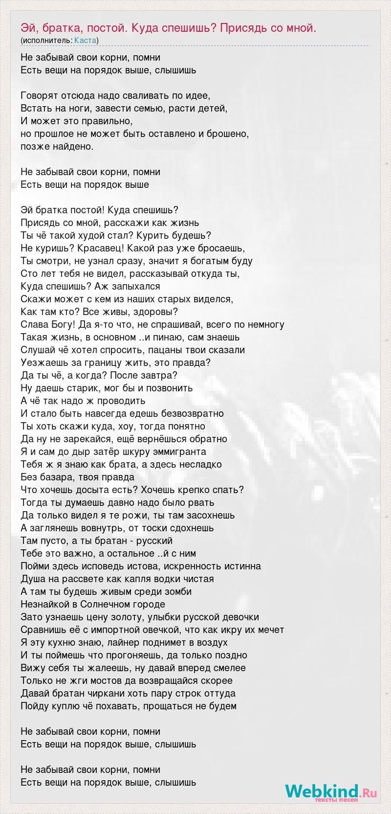 Не забывай свои корни, помни Есть вещи на порядок выше, слышишь Говорят отсюда надо сваливать по идее, Встать на ноги, завести семью, расти детей, И может это правильно, но прошлое не может быть оставлено и брошено, позже найдено. Не забывай свои корни, помни Есть вещи на порядок выше Эй братка постой! Куда спешишь? Присядь со мной, расскажи как жизнь Ты чё такой худой стал? Курить будешь? Не куришь? Красавец! Какой раз уже бросаешь, Ты смотри, не узнал сразу, значит я богатым буду Сто лет тебя не видел, рассказывай откуда ты, Куда спешишь? Аж запыхался Скажи может с кем из наших старых виделся, Как там кто? Все живы, здоровы? Слава Богу! Да я-то что, не спрашивай, всего по немногу Такая жизнь, в основном ..и пинаю, сам знаешь Слушай чё хотел спросить, пацаны твои сказали Уезжаешь за границу жить, это правда? Да ты чё, а когда? После завтра? Ну даешь старик, мог бы и позвонить А чё так надо ж проводить И стало быть навсегда едешь безвозвратно Ты хоть скажи куда, хоу, тогда понятно Да ну не зарекайся, ещё вернёшься обратно Я и сам до дыр затёр шкуру эммигранта Тебя ж я знаю как брата, а здесь несладко Без базара, твоя правда Что хочешь досыта есть? Хочешь крепко спать? Тогда ты думаешь давно надо было рвать Да только видел я те рожи, ты там засохнешь А заглянешь вовнутрь, от тоски сдохнешь Там пусто, а ты братан - русский Тебе это важно, а остальное ..й с ним Пойми здесь исповедь истова, искренность истинна Душа на рассвете как капля водки чистая А там ты будешь живым среди зомби Незнайкой в Солнечном городе Зато узнаешь цену золоту, улыбки русской девочки Сравнишь её с импортной овечкой, что как икру их мечет Я эту кухню знаю, лайнер поднимет в воздух И ты поймешь что прогоняешь, да только поздно Вижу себя ты жалеешь, ну давай вперед смелее Только не жги мостов да возвращайся скорее Давай братан чиркани хоть пару строк оттуда Пойду куплю чё похавать, прощаться не будем Не забывай свои корни, помни Есть вещи на порядок выше, слышишь Не забывай свои корни, помни Есть вещи на порядок выше, слышишь