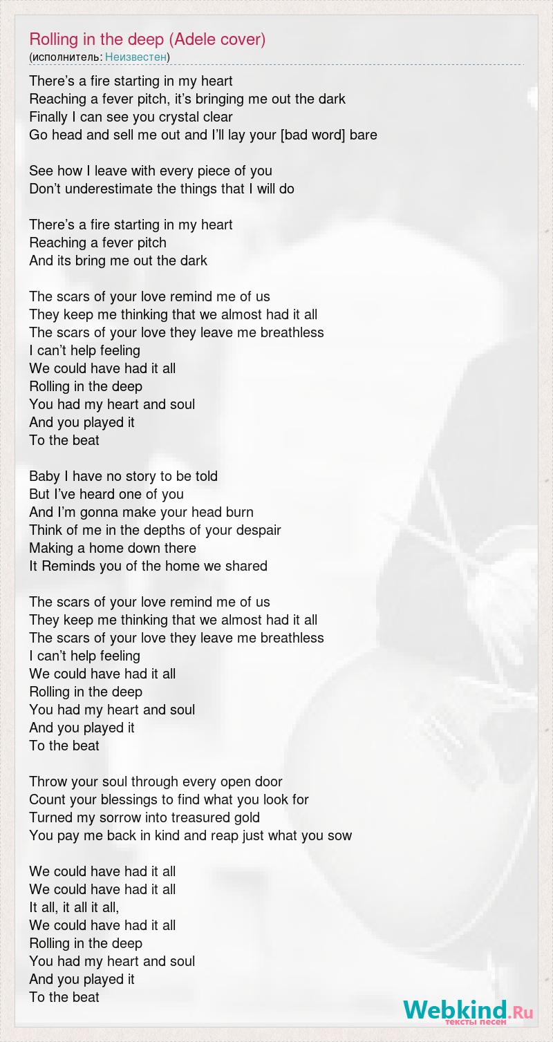 There’s a fire starting in my heart Reaching a fever pitch, it’s bringing me out the dark Finally I can see you crystal clear Go head and sell me out and I’ll lay your [bad word] bare See how I leave with every piece of you Don’t underestimate the things that I will do There’s a fire starting in my heart Reaching a fever pitch And its bring me out the dark The scars of your love remind me of us They keep me thinking that we almost had it all The scars of your love they leave me breathless I can’t help feeling We could have had it all Rolling in the deep You had my heart and soul And you played it To the beat Baby I have no story to be told But I’ve heard one of you And I’m gonna make your head burn Think of me in the depths of your despair Making a home down there It Reminds you of the home we shared The scars of your love remind me of us They keep me thinking that we almost had it all The scars of your love they leave me breathless I can’t help feeling We could have had it all Rolling in the deep You had my heart and soul And you played it To the beat Throw your soul through every open door Count your blessings to find what you look for Turned my sorrow into treasured gold You pay me back in kind and reap just what you sow We could have had it all We could have had it all It all, it all it all, We could have had it all Rolling in the deep You had my heart and soul And you played it To the beat