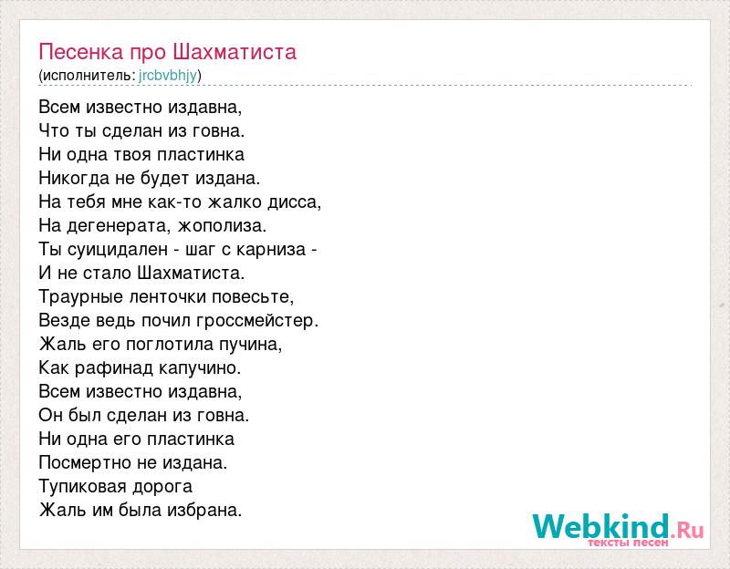 Всем известно издавна, Что ты сделан из говна. Ни одна твоя пластинка Никогда не будет издана. На тебя мне как-то жалко дисса, На дегенерата, жополиза. Ты суицидален - шаг с карниза - И не стало Шахматиста. Траурные ленточки повесьте, Везде ведь почил гроссмейстер. Жаль его поглотила пучина, Как рафинад капучино. Всем известно издавна, Он был сделан из говна. Ни одна его пластинка Посмертно не издана. Тупиковая дорога Жаль им была избрана.