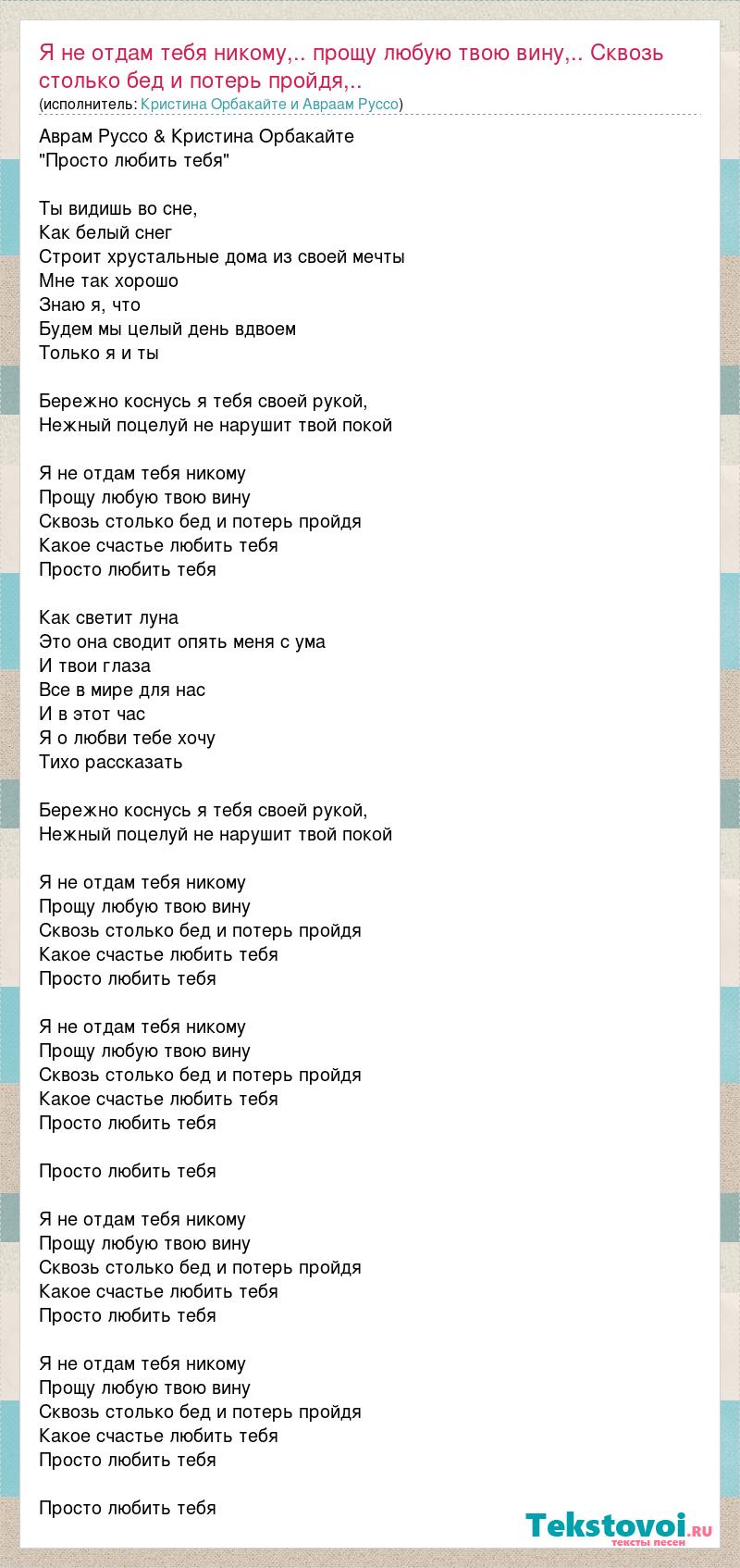 Аврам Руссо & Кристина Орбакайте "Просто любить тебя" Ты видишь во сне, Как белый снег Строит хрустальные дома из своей мечты Мне так хорошо Знаю я, что Будем мы целый день вдвоем Только я и ты Бережно коснусь я тебя своей рукой, Нежный поцелуй не нарушит твой покой Я не отдам тебя никому Прощу любую твою вину Сквозь столько бед и потерь пройдя Какое счастье любить тебя Просто любить тебя Как светит луна Это она сводит опять меня с ума И твои глаза Все в мире для нас И в этот час Я о любви тебе хочу Тихо рассказать Бережно коснусь я тебя своей рукой, Нежный поцелуй не нарушит твой покой Я не отдам тебя никому Прощу любую твою вину Сквозь столько бед и потерь пройдя Какое счастье любить тебя Просто любить тебя Я не отдам тебя никому Прощу любую твою вину Сквозь столько бед и потерь пройдя Какое счастье любить тебя Просто любить тебя Просто любить тебя Я не отдам тебя никому Прощу любую твою вину Сквозь столько бед и потерь пройдя Какое счастье любить тебя Просто любить тебя Я не отдам тебя никому Прощу любую твою вину Сквозь столько бед и потерь пройдя Какое счастье любить тебя Просто любить тебя Просто любить тебя