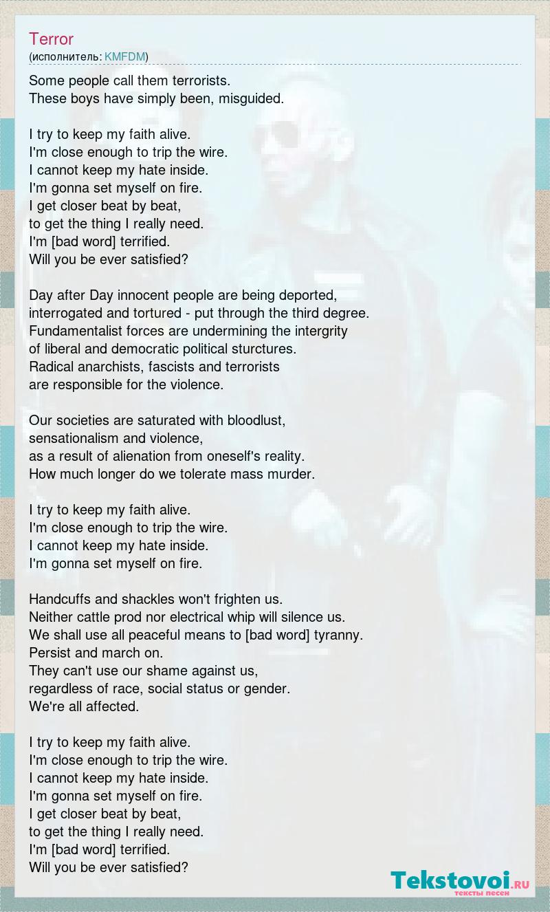 Some people call them terrorists. These boys have simply been, misguided. I try to keep my faith alive. I'm close enough to trip the wire. I cannot keep my hate inside. I'm gonna set myself on fire. I get closer beat by beat, to get the thing I really need. I'm [bad word] terrified. Will you be ever satisfied? Day after Day innocent people are being deported, interrogated and tortured - put through the third degree. Fundamentalist forces are undermining the intergrity of liberal and democratic political sturctures. Radical anarchists, fascists and terrorists are responsible for the violence. Our societies are saturated with bloodlust, sensationalism and violence, as a result of alienation from oneself's reality. How much longer do we tolerate mass murder. I try to keep my faith alive. I'm close enough to trip the wire. I cannot keep my hate inside. I'm gonna set myself on fire. Handcuffs and shackles won't frighten us. Neither cattle prod nor electrical whip will silence us. We shall use all peaceful means to [bad word] tyranny. Persist and march on. They can't use our shame against us, regardless of race, social status or gender. We're all affected. I try to keep my faith alive. I'm close enough to trip the wire. I cannot keep my hate inside. I'm gonna set myself on fire. I get closer beat by beat, to get the thing I really need. I'm [bad word] terrified. Will you be ever satisfied?