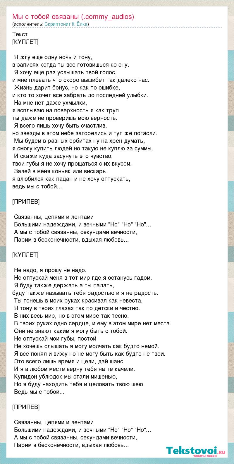 Текст [КУПЛЕТ] Я жгу еще одну ночь и тону, в записях когда ты все готовишься ко сну. Я хочу еще раз услышать твой голос, и мне плевать что скоро вышибет так далеко нас. Жизнь дарит бонус, но как по ошибке, и кто то хочет все забрать до последней улыбки. На мне нет даже ухмылки, я всплываю на поверхность я как труп ты даже не проверишь мою верность. Я всего лишь хочу быть счастлив, но звезды в этом небе загорелись и тут же погасли. Мы будем в разных орбитах ну на хрен думать, я смогу купить людей но такую не куплю за суммы. И скажи куда засунуть это чувство, твои губы я не хочу прощаться с их вкусом. Залей в меня коньяк или вискарь я влюбился как пацан и не хочу отпускать, ведь мы с тобой... [ПРИПЕВ] Связанны, цепями и лентами Большими надеждами, и вечными "Но" "Но" "Но"... А мы с тобой связанны, секундами вечности, Парим в бесконечности, вдыхая любовь... [КУПЛЕТ] Не надо, я прошу не надо. Не отпускай меня в тот мир где я останусь гадом. Я буду также держать а ты падать, буду также называть тебя радостью и я не радость. Ты тонешь в моих руках красивая как невеста, Я тону в твоих глазах так по детски и честно. В них весь мир, но в этом мире так тесно. В твоих руках одно сердце, и ему в этом мире нет места. Они не знают каким я могу быть с тобой. Не отпускай мои губы, постой Не хочешь слышать я могу молчать как будто немой. Я все понял и вижу но не могу быть как будто не твой. Это всего лишь время и цели, дай шанс И я в любом месте верну тебя на те качели. Купидон ублюдок мы стали мишенью, Но я буду находить тебя и целовать твою шею Ведь мы с тобой... [ПРИПЕВ] Связанны, цепями и лентами Большими надеждами, и вечными "Но" "Но" "Но"... А мы с тобой связанны, секундами вечности, Парим в бесконечности, вдыхая любовь...