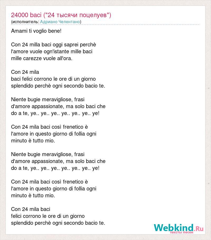 Amami ti voglio bene! Con 24 milla baci oggi saprei perchè l'amore vuole ogn'istante mille baci mille carezze vuole all'ora. Con 24 mila baci felici corrono le ore di un giorno splendido perchè ogni secondo bacio te. Niente bugie meravigliose, frasi d'amore appassionate, ma solo baci che do a te, ye.. ye.. ye.. ye.. ye.. ye.. ye! Con 24 mila baci così frenetico è l'amore in questo giorno di follia ogni minuto è tutto mio. Niente bugie meravigliose, frasi d'amore appassionate, ma solo baci che do a te, ye.. ye.. ye.. ye.. ye.. ye.. ye! Con 24 mila baci così frenetico è l'amore in questo giorno di follia ogni minuto è tutto mio. Con 24 mila baci felici corrono le ore di un giorno splendido perchè ogni secondo bacio te.