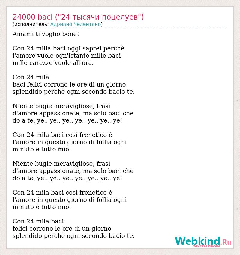 Amami ti voglio bene! Con 24 milla baci oggi saprei perchè l'amore vuole ogn'istante mille baci mille carezze vuole all'ora. Con 24 mila baci felici corrono le ore di un giorno splendido perchè ogni secondo bacio te. Niente bugie meravigliose, frasi d'amore appassionate, ma solo baci che do a te, ye.. ye.. ye.. ye.. ye.. ye.. ye! Con 24 mila baci così frenetico è l'amore in questo giorno di follia ogni minuto è tutto mio. Niente bugie meravigliose, frasi d'amore appassionate, ma solo baci che do a te, ye.. ye.. ye.. ye.. ye.. ye.. ye! Con 24 mila baci così frenetico è l'amore in questo giorno di follia ogni minuto è tutto mio. Con 24 mila baci felici corrono le ore di un giorno splendido perchè ogni secondo bacio te.