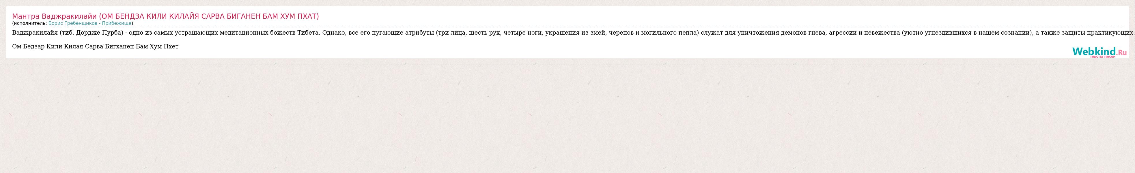 Главная→Исполнители→Борис Гребенщиков - Прибежище→Мантра Ваджракилайи (ОМ БЕНДЗА КИЛИ КИЛАЙЯ САРВА БИГАНЕН БАМ ХУМ ПХАТ)
