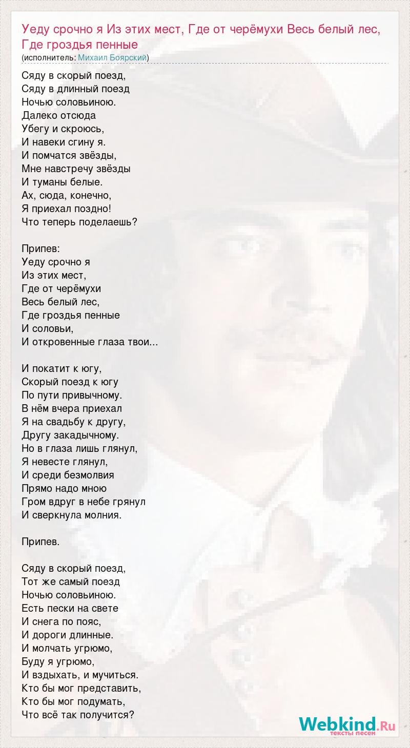 Сяду в скорый поезд, Сяду в длинный поезд Ночью соловьиною. Далеко отсюда Убегу и скроюсь, И навеки сгину я. И помчатся звёзды, Мне навстречу звёзды И туманы белые. Ах, сюда, конечно, Я приехал поздно! Что теперь поделаешь? Припев: Уеду срочно я Из этих мест, Где от черёмухи Весь белый лес, Где гроздья пенные И соловьи, И откровенные глаза твои... И покатит к югу, Скорый поезд к югу По пути привычному. В нём вчера приехал Я на свадьбу к другу, Другу закадычному. Но в глаза лишь глянул, Я невесте глянул, И среди безмолвия Прямо надо мною Гром вдруг в небе грянул И сверкнула молния. Припев. Сяду в скорый поезд, Тот же самый поезд Ночью соловьиною. Есть пески на свете И снега по пояс, И дороги длинные. И молчать угрюмо, Буду я угрюмо, И вздыхать, и мучиться. Кто бы мог представить, Кто бы мог подумать, Что всё так получится?