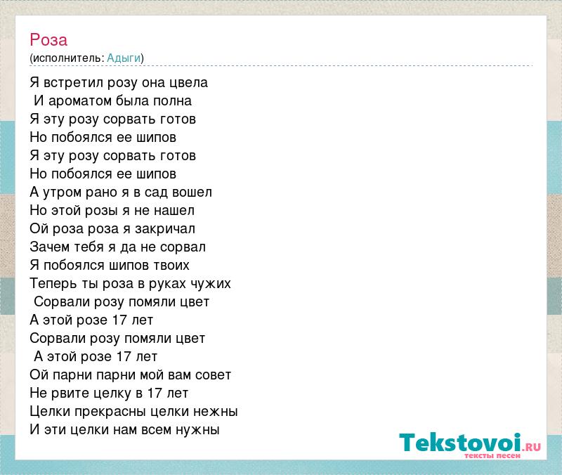 Я встретил розу она цвела И ароматом была полна Я эту розу сорвать готов Но побоялся ее шипов Я эту розу сорвать готов Но побоялся ее шипов А утром рано я в сад вошел Но этой розы я не нашел Ой роза роза я закричал Зачем тебя я да не сорвал Я побоялся шипов твоих Теперь ты роза в руках чужих Сорвали розу помяли цвет А этой розе 17 лет Сорвали розу помяли цвет А этой розе 17 лет Ой парни парни мой вам совет Не рвите целку в 17 лет Целки прекрасны целки нежны И эти целки нам всем нужны