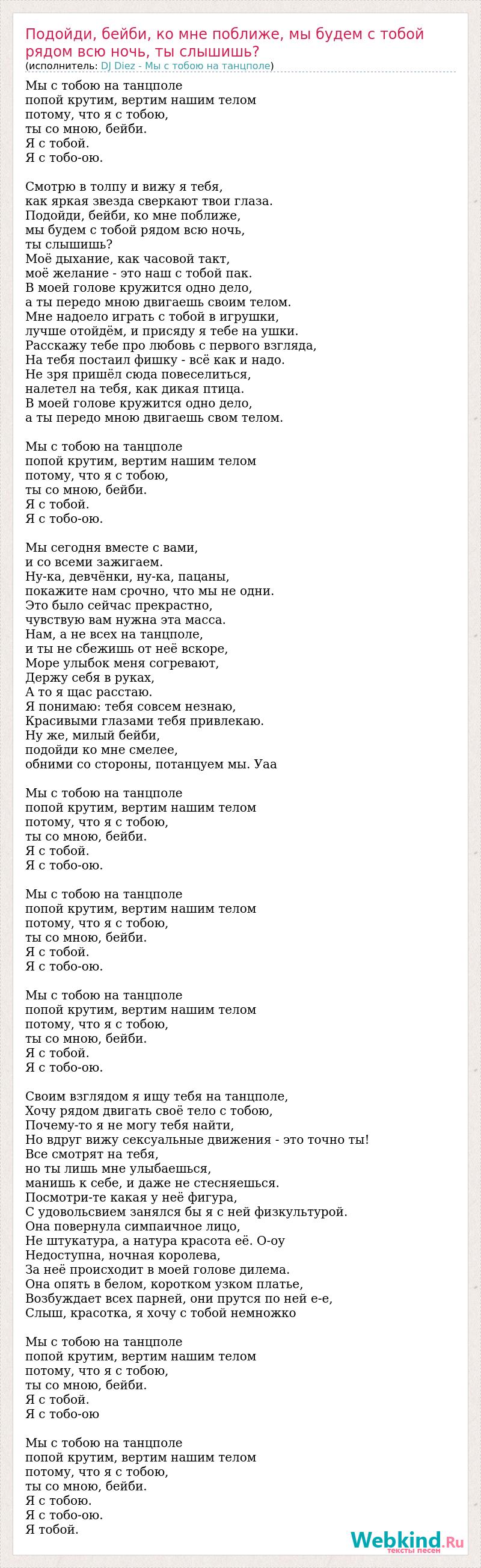 Мы с тобою на танцполе попой крутим, вертим нашим телом потому, что я с тобою, ты со мною, бейби. Я с тобой. Я с тобо-ою. Смотрю в толпу и вижу я тебя, как яркая звезда сверкают твои глаза. Подойди, бейби, ко мне поближе, мы будем с тобой рядом всю ночь, ты слышишь? Моё дыхание, как часовой такт, моё желание - это наш с тобой пак. В моей голове кружится одно дело, а ты передо мною двигаешь своим телом. Мне надоело играть с тобой в игрушки, лучше отойдём, и присяду я тебе на ушки. Расскажу тебе про любовь с первого взгляда, На тебя постаил фишку - всё как и надо. Не зря пришёл сюда повеселиться, налетел на тебя, как дикая птица. В моей голове кружится одно дело, а ты передо мною двигаешь свом телом. Мы с тобою на танцполе попой крутим, вертим нашим телом потому, что я с тобою, ты со мною, бейби. Я с тобой. Я с тобо-ою. Мы сегодня вместе с вами, и со всеми зажигаем. Ну-ка, девчёнки, ну-ка, пацаны, покажите нам срочно, что мы не одни. Это было сейчас прекрастно, чувствую вам нужна эта масса. Нам, а не всех на танцполе, и ты не сбежишь от неё вскоре, Море улыбок меня согревают, Держу себя в руках, А то я щас расстаю. Я понимаю: тебя совсем незнаю, Красивыми глазами тебя привлекаю. Ну же, милый бейби, подойди ко мне смелее, обними со стороны, потанцуем мы. Уаа Мы с тобою на танцполе попой крутим, вертим нашим телом потому, что я с тобою, ты со мною, бейби. Я с тобой. Я с тобо-ою. Мы с тобою на танцполе попой крутим, вертим нашим телом потому, что я с тобою, ты со мною, бейби. Я с тобой. Я с тобо-ою. Мы с тобою на танцполе попой крутим, вертим нашим телом потому, что я с тобою, ты со мною, бейби. Я с тобой. Я с тобо-ою. Своим взглядом я ищу тебя на танцполе, Хочу рядом двигать своё тело с тобою, Почему-то я не могу тебя найти, Но вдруг вижу сексуальные движения - это точно ты! Все смотрят на тебя, но ты лишь мне улыбаешься, манишь к себе, и даже не стесняешься. Посмотри-те какая у неё фигура, С удовольсвием занялся бы я с ней физкультурой. Она повернула симпаичное лицо, Не штукатура, а натура красота её. О-оу Недоступна, ночная королева, За неё происходит в моей голове дилема. Она опять в белом, коротком узком платье, Возбуждает всех парней, они прутся по ней е-е, Слыш, красотка, я хочу с тобой немножко Мы с тобою на танцполе попой крутим, вертим нашим телом потому, что я с тобою, ты со мною, бейби. Я с тобой. Я с тобо-ою Мы с тобою на танцполе попой крутим, вертим нашим телом потому, что я с тобою, ты со мною, бейби. Я с тобою. Я с тобо-ою. Я тобой.