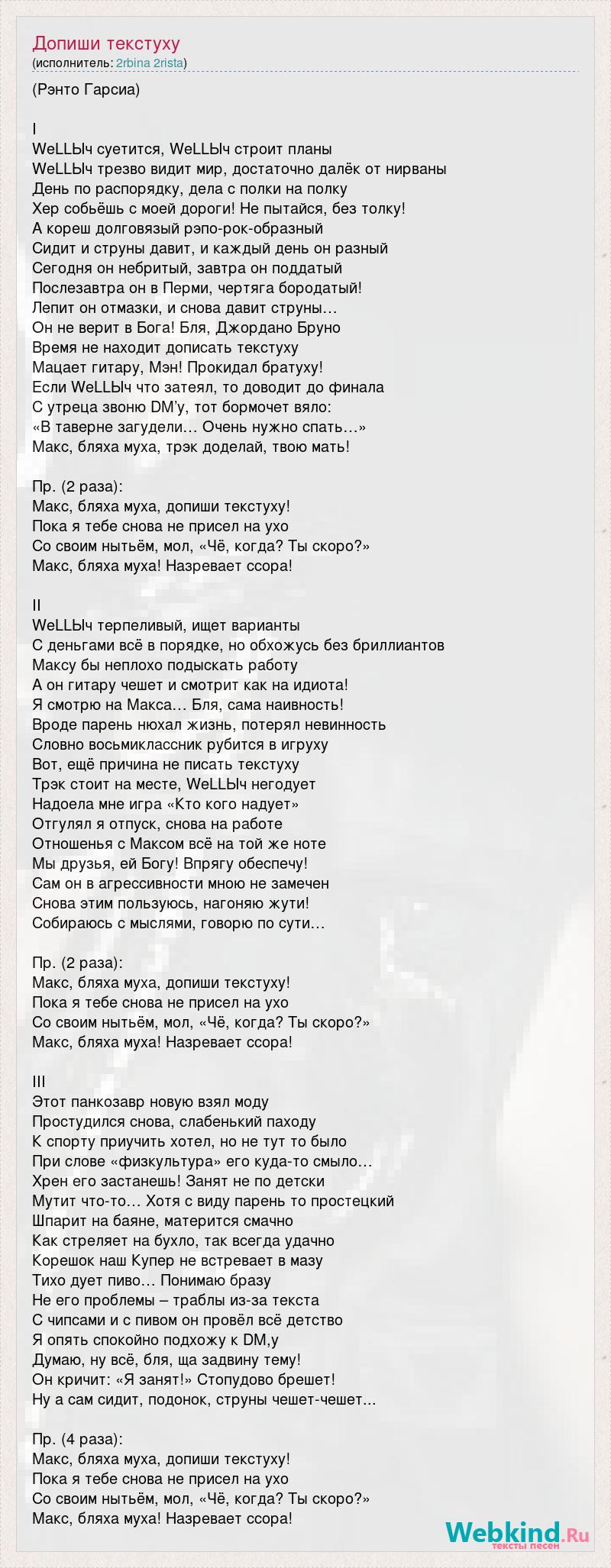 (Рэнто Гарсиа) I WeLLЫч суетится, WeLLЫч строит планы WeLLЫч трезво видит мир, достаточно далёк от нирваны День по распорядку, дела с полки на полку Хер собьёшь с моей дороги! Не пытайся, без толку! А кореш долговязый рэпо-рок-образный Сидит и струны давит, и каждый день он разный Сегодня он небритый, завтра он поддатый Послезавтра он в Перми, чертяга бородатый! Лепит он отмазки, и снова давит струны… Он не верит в Бога! Бля, Джордано Бруно Время не находит дописать текстуху Мацает гитару, Мэн! Прокидал братуху! Если WeLLЫч что затеял, то доводит до финала С утреца звоню DM’у, тот бормочет вяло: «В таверне загудели… Очень нужно спать…» Макс, бляха муха, трэк доделай, твою мать! Пр. (2 раза): Макс, бляха муха, допиши текстуху! Пока я тебе снова не присел на ухо Со своим нытьём, мол, «Чё, когда? Ты скоро?» Макс, бляха муха! Назревает ссора! II WeLLЫч терпеливый, ищет варианты С деньгами всё в порядке, но обхожусь без бриллиантов Максу бы неплохо подыскать работу А он гитару чешет и смотрит как на идиота! Я смотрю на Макса… Бля, сама наивность! Вроде парень нюхал жизнь, потерял невинность Словно восьмиклассник рубится в игруху Вот, ещё причина не писать текстуху Трэк стоит на месте, WeLLЫч негодует Надоела мне игра «Кто кого надует» Отгулял я отпуск, снова на работе Отношенья с Максом всё на той же ноте Мы друзья, ей Богу! Впрягу обеспечу! Сам он в агрессивности мною не замечен Снова этим пользуюсь, нагоняю жути! Собираюсь с мыслями, говорю по сути… Пр. (2 раза): Макс, бляха муха, допиши текстуху! Пока я тебе снова не присел на ухо Со своим нытьём, мол, «Чё, когда? Ты скоро?» Макс, бляха муха! Назревает ссора! III Этот панкозавр новую взял моду Простудился снова, слабенький паходу К спорту приучить хотел, но не тут то было При слове «физкультура» его куда-то смыло… Хрен его застанешь! Занят не по детски Мутит что-то… Хотя с виду парень то простецкий Шпарит на баяне, матерится смачно Как стреляет на бухло, так всегда удачно Корешок наш Купер не встревает в мазу Тихо дует пиво… Понимаю бразу Не его проблемы – траблы из-за текста С чипсами и с пивом он провёл всё детство Я опять спокойно подхожу к DM,у Думаю, ну всё, бля, ща задвину тему! Он кричит: «Я занят!» Стопудово брешет! Ну а сам сидит, подонок, струны чешет-чешет... Пр. (4 раза): Макс, бляха муха, допиши текстуху! Пока я тебе снова не присел на ухо Со своим нытьём, мол, «Чё, когда? Ты скоро?» Макс, бляха муха! Назревает ссора!