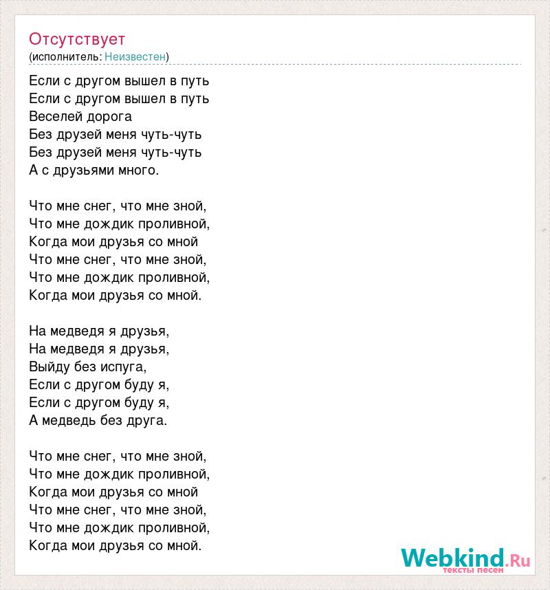 Если с другом вышел в путь Если с другом вышел в путь Веселей дорога Без друзей меня чуть-чуть Без друзей меня чуть-чуть А с друзьями много. Что мне снег, что мне зной, Что мне дождик проливной, Когда мои друзья со мной Что мне снег, что мне зной, Что мне дождик проливной, Когда мои друзья со мной. На медведя я друзья, На медведя я друзья, Выйду без испуга, Если с другом буду я, Если с другом буду я, А медведь без друга. Что мне снег, что мне зной, Что мне дождик проливной, Когда мои друзья со мной Что мне снег, что мне зной, Что мне дождик проливной, Когда мои друзья со мной.