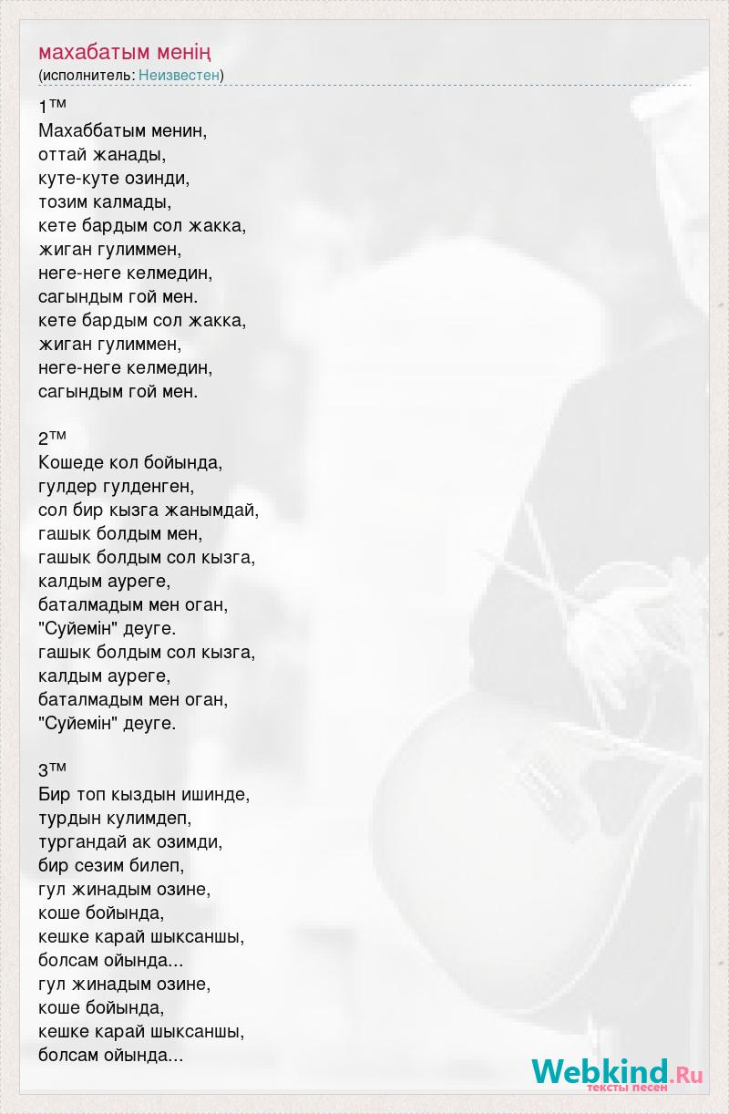 1™ Махаббатым менин, оттай жанады, куте-куте озинди, тозим калмады, кете бардым сол жакка, жиган гулиммен, неге-неге келмедин, сагындым гой мен. кете бардым сол жакка, жиган гулиммен, неге-неге келмедин, сагындым гой мен. 2™ Кошеде кол бойында, гулдер гулденген, сол бир кызга жанымдай, гашык болдым мен, гашык болдым сол кызга, калдым ауреге, баталмадым мен оган, "Суйемiн" деуге. гашык болдым сол кызга, калдым ауреге, баталмадым мен оган, "Суйемiн" деуге. 3™ Бир топ кыздын ишинде, турдын кулимдеп, тургандай ак озимди, бир сезим билеп, гул жинадым озине, коше бойында, кешке карай шыксаншы, болсам ойында... гул жинадым озине, коше бойында, кешке карай шыксаншы, болсам ойында...