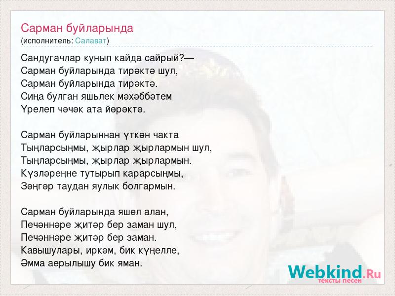 Сандугачлар кунып кайда сайрый?— Сарман буйларында тирәктә шул, Сарман буйларында тирәктә. Сиңа булган яшьлек мәхәббәтем Үрелеп чәчәк ата йөрәктә. Сарман буйларыннан үткән чакта Тыңларсыңмы, җырлар җырлармын шул, Тыңларсыңмы, җырлар җырлармын. Күзләреңне тутырып карарсыңмы, Зәңгәр таудан яулык болгармын. Сарман буйларында яшел алан, Печәннәре җитәр бер заман шул, Печәннәре җитәр бер заман. Кавышулары, иркәм, бик күңелле, Әмма аерылышу бик яман.