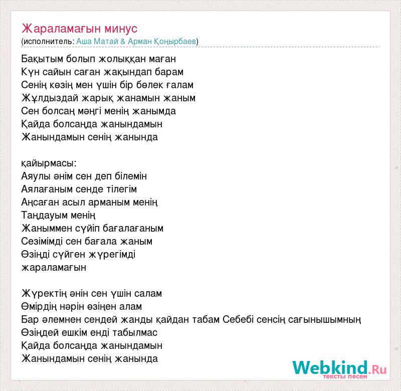 Бақытым болып жолыққан маған Күн сайын саған жақындап барам Сенің көзің мен үшін бір бөлек ғалам Жұлдыздай жарық жанамын жаным Сен болсаң мәңгі менің жанымда Қайда болсаңда жанындамын Жанындамын сенің жанында қайырмасы: Аяулы әнім сен деп білемін Аялағаным сенде тілегім Аңсаған асыл арманым менің Таңдауым менің Жаныммен сүйіп бағалағаным Сезімімді сен бағала жаным Өзіңді сүйген жүрегімді жараламағын Жүректің әнін сен үшін салам Өмірдің нәрін өзіңен алам Бар әлемнен сендей жанды қайдан табам Себебі сенсің сағынышымның Өзіңдей ешкім енді табылмас Қайда болсаңда жанындамын Жанындамын сенің жанында