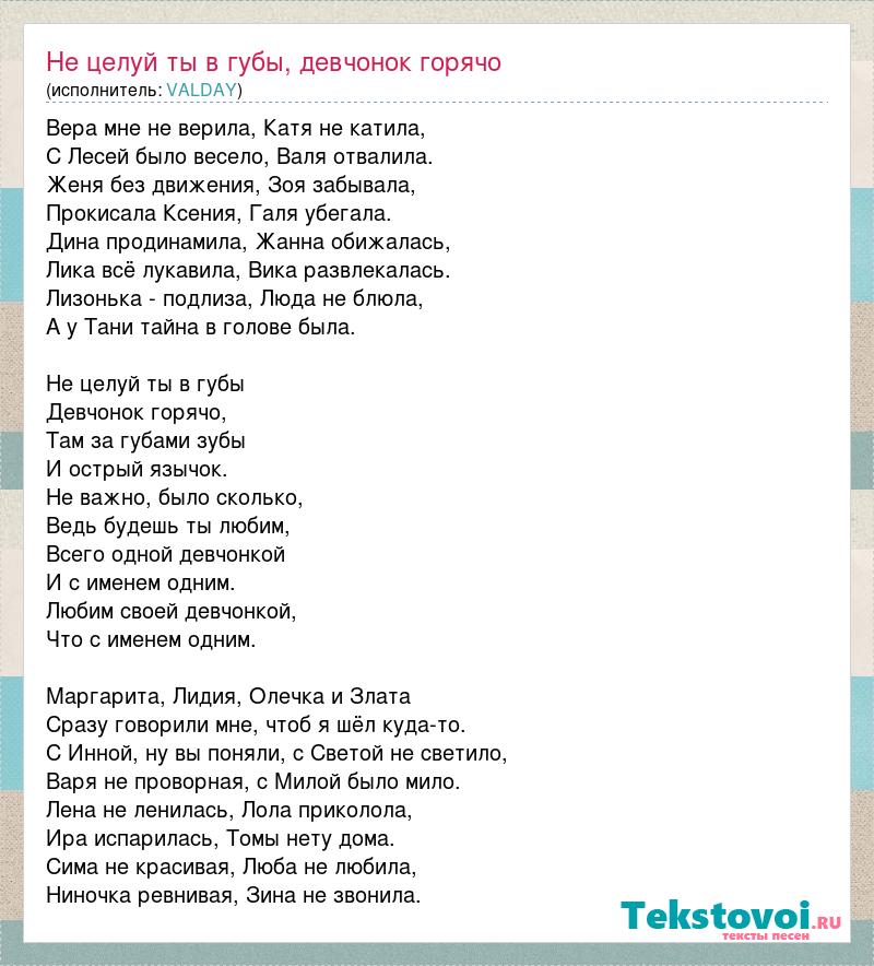 Вера мне не верила, Катя не катила, С Лесей было весело, Валя отвалила. Женя без движения, Зоя забывала, Прокисала Ксения, Галя убегала. Дина продинамила, Жанна обижалась, Лика всё лукавила, Вика развлекалась. Лизонька - подлиза, Люда не блюла, А у Тани тайна в голове была. Не целуй ты в губы Девчонок горячо, Там за губами зубы И острый язычок. Не важно, было сколько, Ведь будешь ты любим, Всего одной девчонкой И с именем одним. Любим своей девчонкой, Что с именем одним. Маргарита, Лидия, Олечка и Злата Сразу говорили мне, чтоб я шёл куда-то. С Инной, ну вы поняли, с Светой не светило, Варя не проворная, с Милой было мило. Лена не ленилась, Лола приколола, Ира испарилась, Томы нету дома. Сима не красивая, Люба не любила, Ниночка ревнивая, Зина не звонила.
